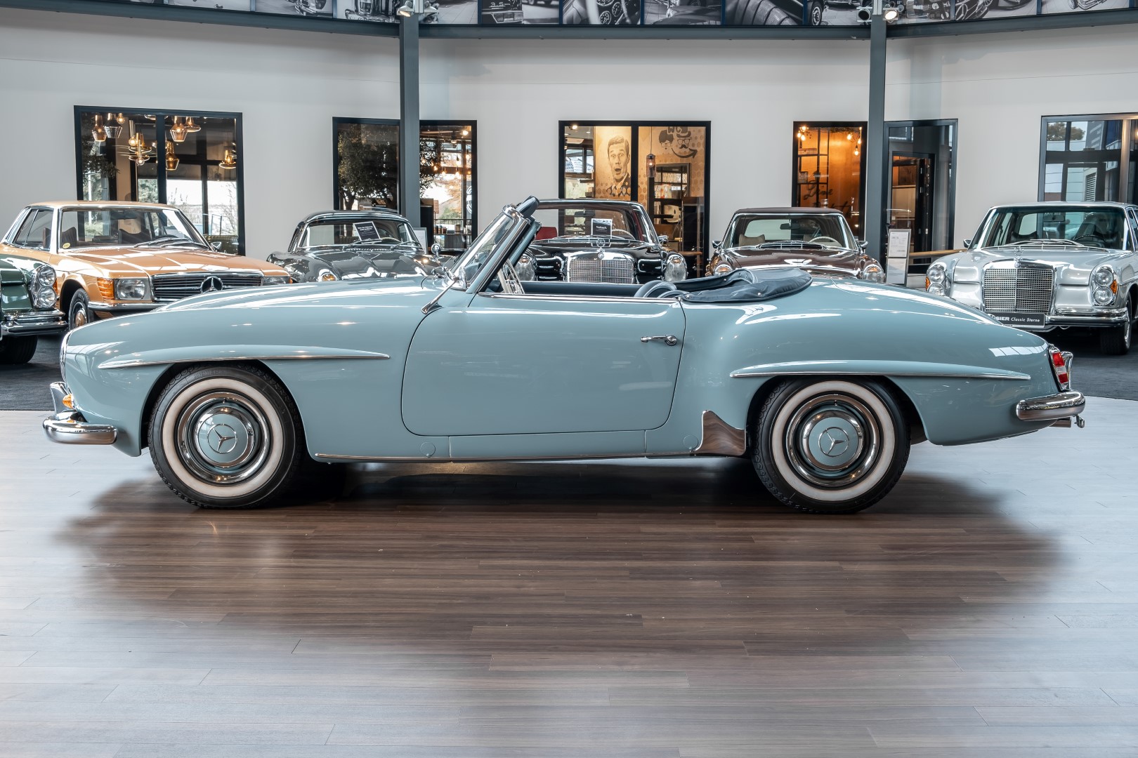 Dieser traumhafte 190 SL der Baureihe W121 wurde im Jahre 1962 fertiggestellt und gelang anschließend ins sonnige Kalifornien. Über 40 Jahre verblieb das Fahrzeug im Sonnenstaat bis das Fahrzeug im Jahre 1997 zurück nach Deutschland gelang. Durch das trockenwarme Klima war die Basis für die Restauration ideal. Bei einem renommierten Fachbetrieb wurde die Restauration von Grund auf und mit einem besonderen Maß an Qualität durchgeführt. Das Ergebnis beeindruckt: ein tadelloser Motorlauf, beste Fahreigenschaften und ein traumhaftes optisches Erscheinungsbild – vom Lackkleid über die Lederausstattung bis hin zum Stoffverdeck. Ein Mercedes-Enthusiast fand Gefallen an dem klassischen Roadster und verliebte sich spontan in die seltene Farbkombination Horizontblau mit dunkelblauem Leder und Verdeck-Stoff. Platzmangel ist der Grund dafür, dass wir Ihnen dieses Fahrzeug aus dessen erlesener Sammlung nun anbieten dürfen. Erleben Sie diesen Ausnahme 190er. Die nächsten Sonnentage kommen bestimmt.