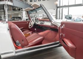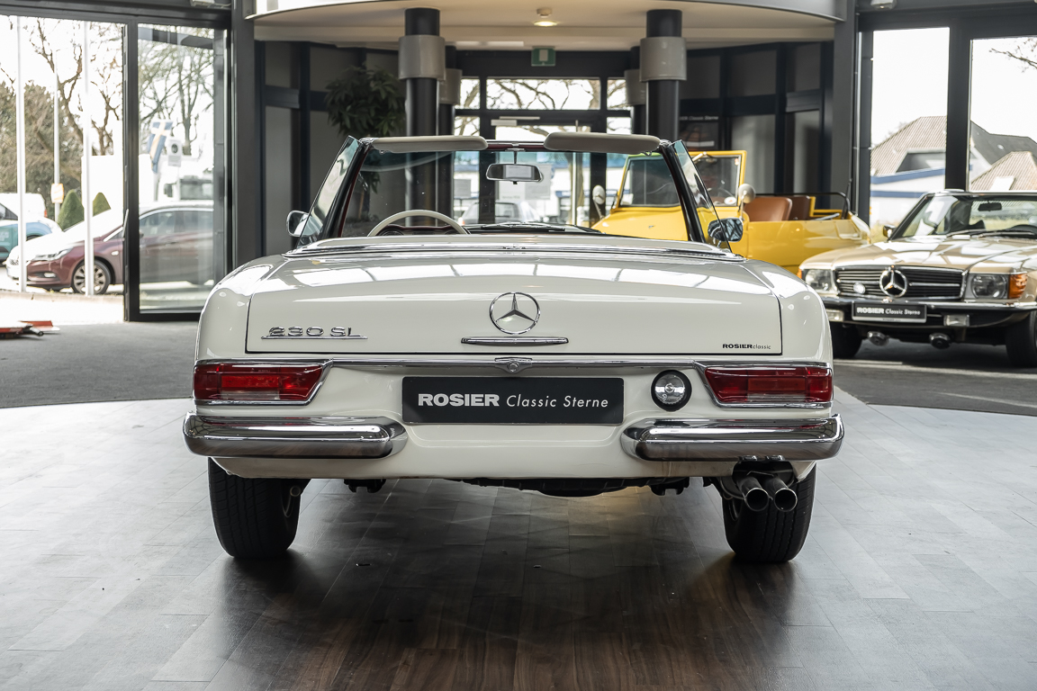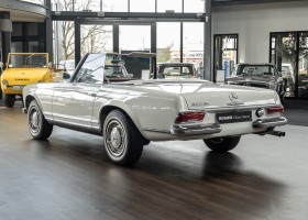 Diese elegante Mercedes-Benz 230SL Pagode aus 1966 wurde an Ihren erste Besitzer im sonnigen Kalifornien/USA ausgeliefert. Die Auslieferungsfarbe war 050 weiß in Verbindung mit rotem Leder. In 2011 erwarben wir den Wagen in Emeryville, einer beschaulichen Kleinstadt im Alameda County im Bundesstaat Kalifornien/USA. Die Substanz der mittlerweile 45 Jahre alten Pagode war ausgezeichnet. Aus Qualitätsüberlegungen heraus haben wir uns trotzdem entschieden, den Wagen umfangreich zu überarbeiten. In diesem Zug wurde auch das in die Jahre gekommene Interieur des Wagens von unserem Sattler in Spitzenqualität erneuert. Nach Fertigstellung in 2012 verkauften wir den Wagen an einen Liebhaber Klassischer Automobile hier in Niedersachsen. Der Wagen kam regelmäßig zu uns in den Service und erhielt vor etwa 1 Jahr eine neue Einspritzpumpe. Der enge Terminkalender des Besitzers lässt Ihm leider nicht viel Zeit für die Nutzung der Pagode. Gerade einmal rund 6.000 km kamen in den letzten 10 Jahren zusammen. So hat sich der bisherige Besitzer nun dazu entschieden, den Wagen in eine neue liebevolle Hand abzugeben. Die Aufgabe des Verkaufs haben wir gerne übernommen. Gerne zeigen wir Ihnen die Pagode ausführlich hier in unserem Showroom in Oldenburg, Sie werden begeistert sein.