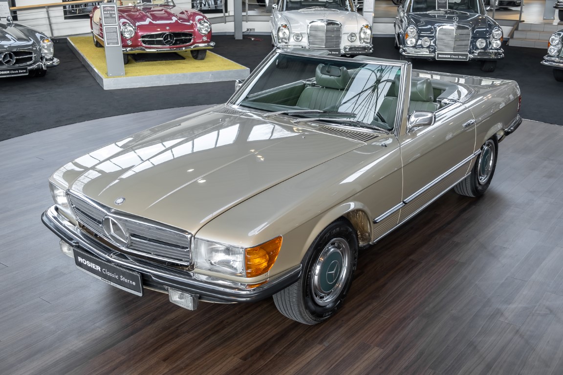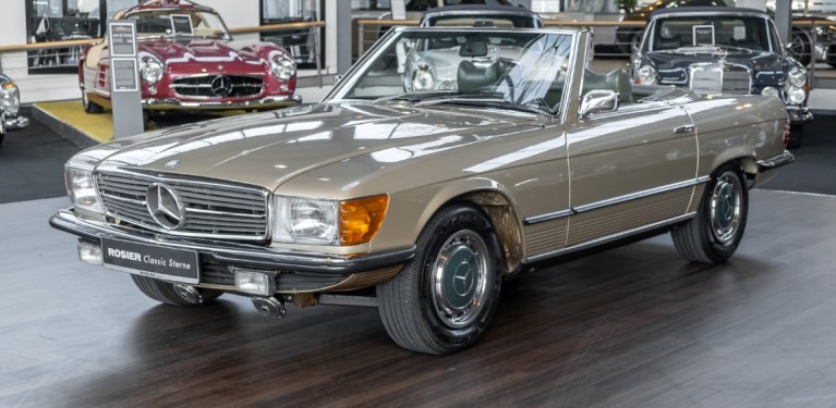 Die Serienproduktion des Mercedes-Benz 350SL Roadsters begann im April 1971 im Werk Sindelfingen. Der hier angebotene Roadster wurde am 25. Oktober 1971 fertiggestellt und in die USA geliefert. Es handelt sich somit um ein ganz frühes Modell und ist für Sammler höchst interessant. Er wurde im Januar 1972 auf den Erstbesitzer zugelassen und verblieb all die Jahre in den USA. Aus der ländlichen ca. 7.000 Einwohner-Gemeinde Sutherlin in Oregon/USA, nur etwa 1 Stunde entfernt von der Winchester Bay am Nord Pacific wurde das Fahrzeug nach Deutschland eingeführt. Der Zustand des Wagens ist sehr original, die unverwüstliche MB-Tex Ausstattung in Olivgrün (166) befindet sich bis heute in einem sehr guten Zustand, die Lackierung wurde offensichtlich vor Jahren erneuert. Der Gesamtzustand des Wagens ist höchst erfreulich, der Unterboden wurde Trockeneisgestrahlt und befindet sich in sauberem und ordentlichen Zustand. Der Motor läuft kraftvoll und weich, das Getriebe wurde erst kürzlich von unseren Spezialisten überholt und schaltet wie man es von einem Mercedes erwartet. Ein rundum toller 107er, der mit seinem starken V8 Motor und einer besonders stilsicheren Farbkombination zu überzeugen weiß. Steigen Sie ein und erfahren Sie es selbst.