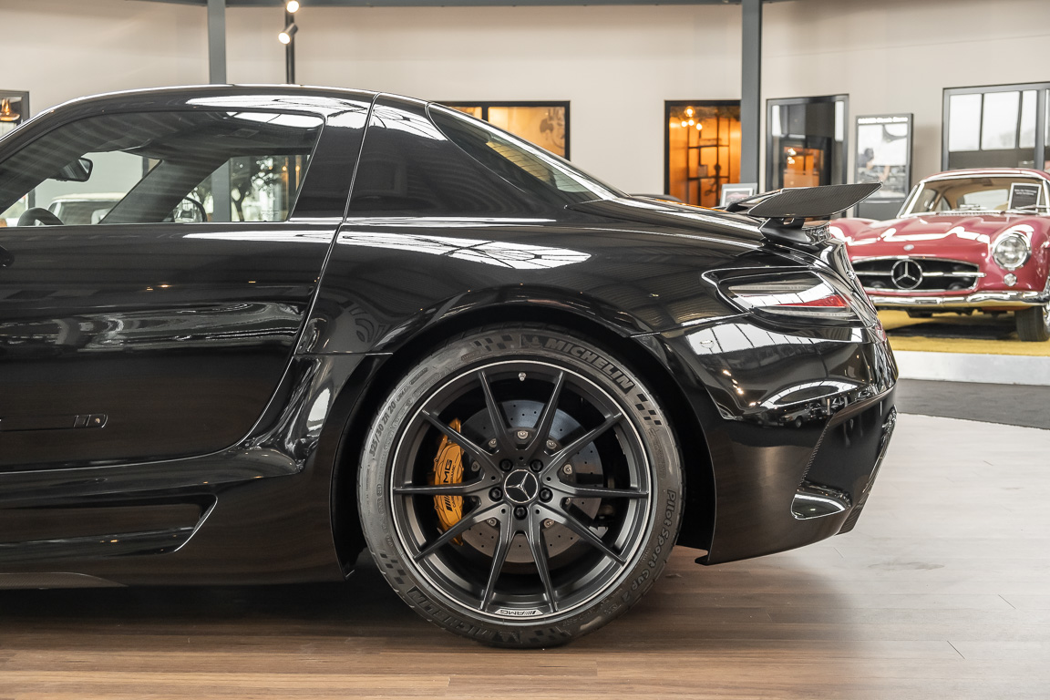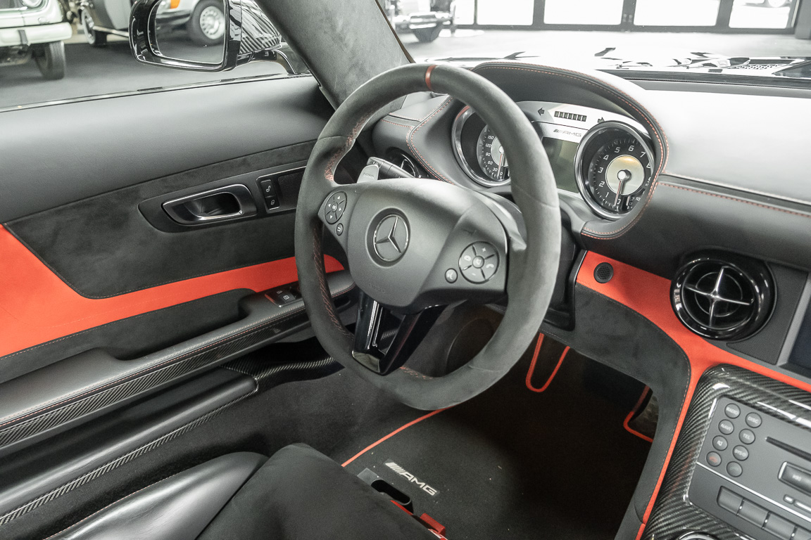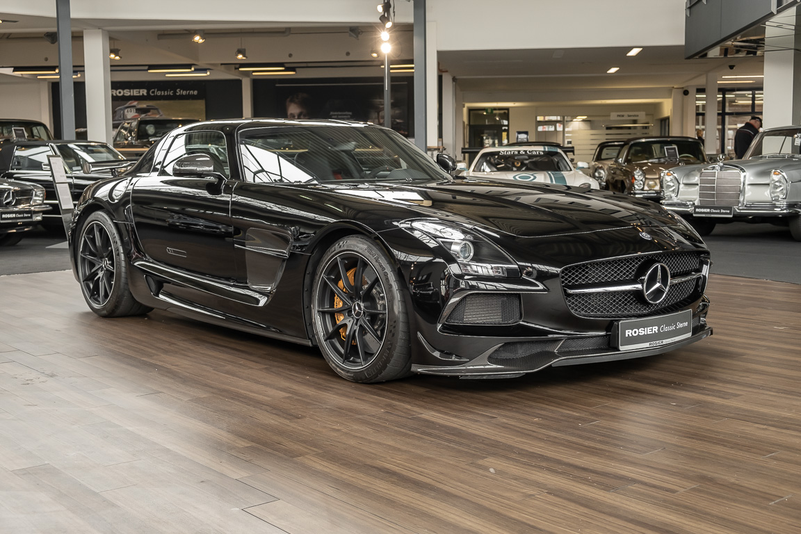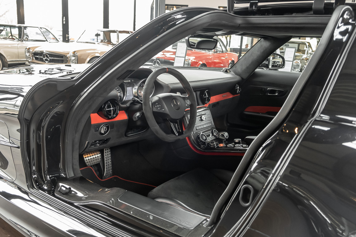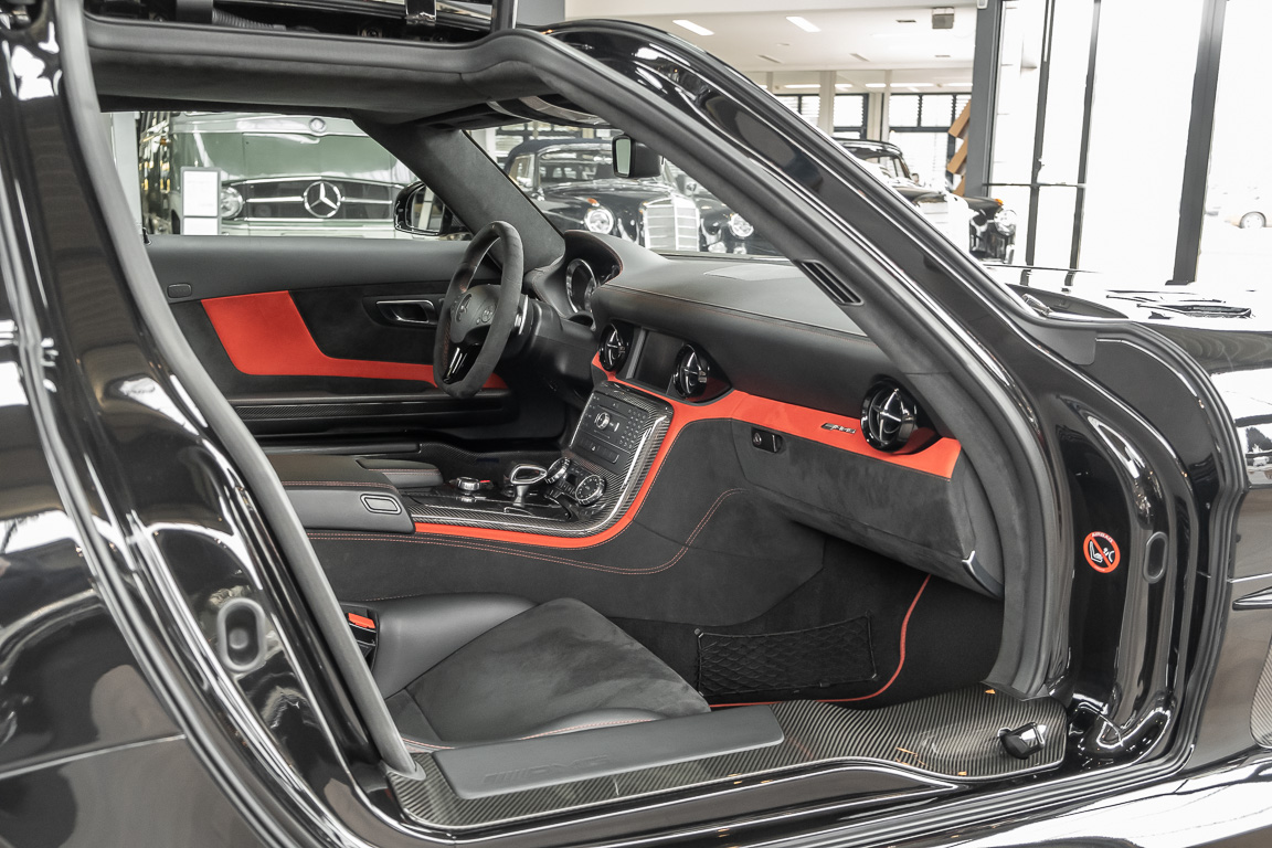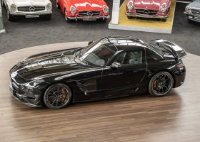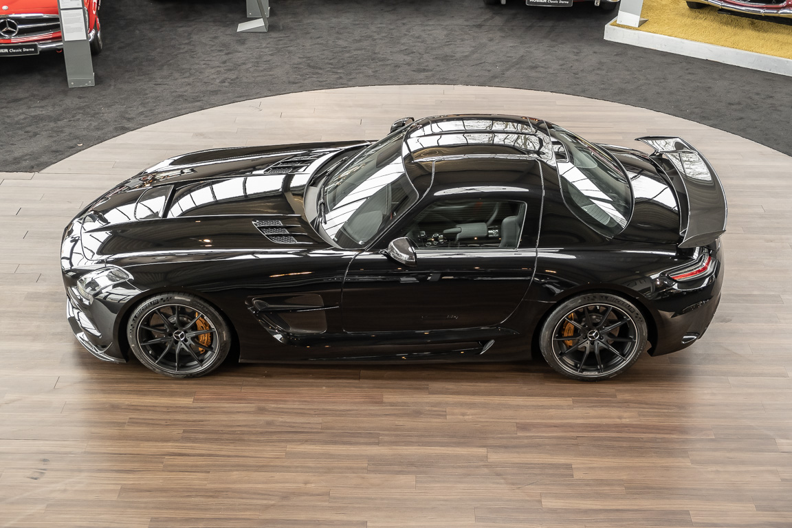 Wir freuen uns, Ihnen die nächste Flügeltür-Ikone nach dem legendären 300 SL anbieten zu können. Der Mercedes-Benz SLS AMG Black Series wurde in Kleinserie, in einer streng limitierten Auflage von 350 Fahrzeugen, aufgelegt und ist für Sammler weltweit ein hochinteressantes Schmuckstück. Mit 631 PS stellt der 6,3l-V8-Saugmotor nicht nur 60 PS mehr Leistung als der Serien SLS bereit, dank intelligentem Leichtbau sorgt der Black Series für Fahrperformance wie ein Rennfahrzeug. Zumindest in der Theorie. In der Praxis wurden die Black Series Modelle trotz Rennsportgenen durch rasant steigende Preise zumeist gelagert und kaum bewegt.