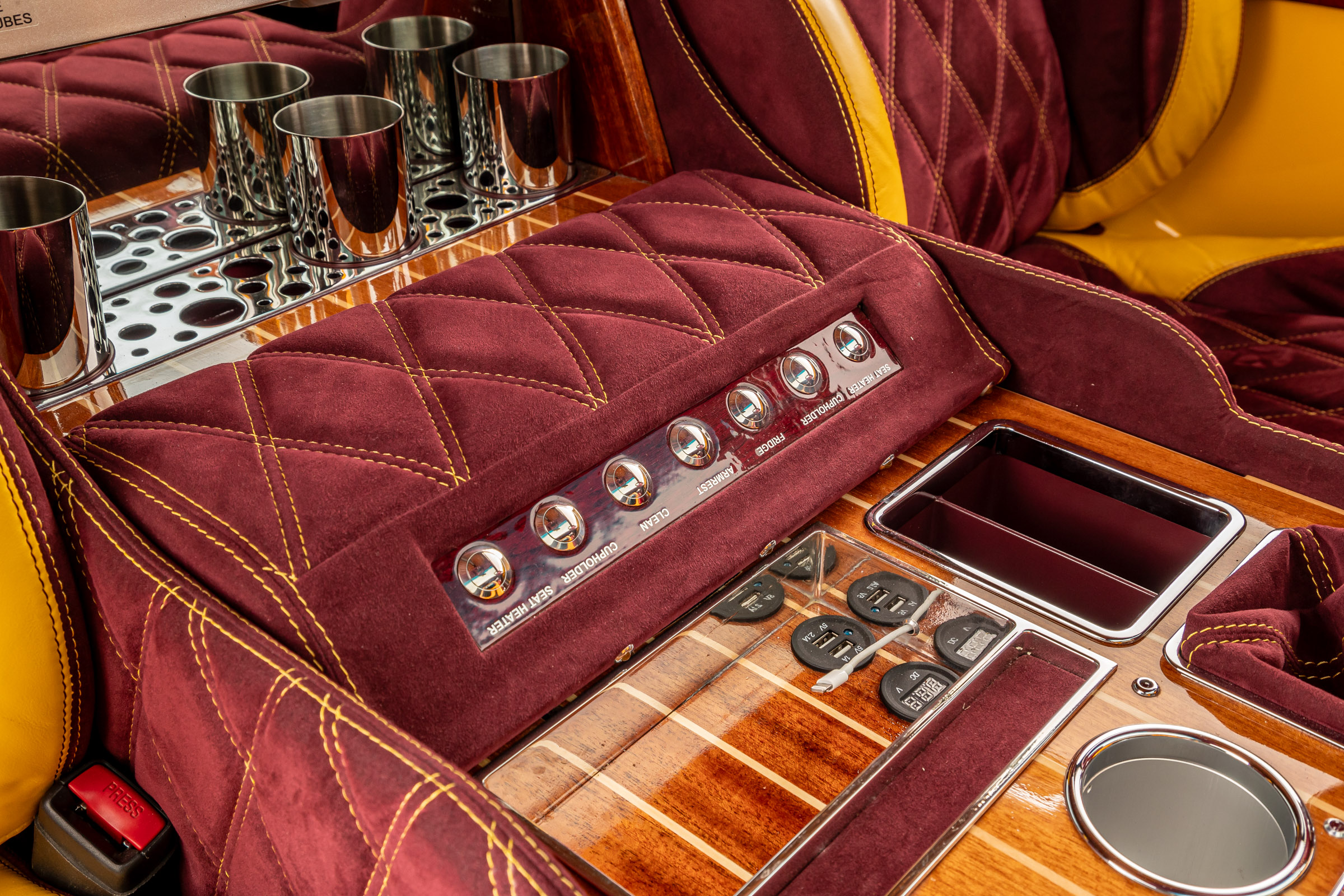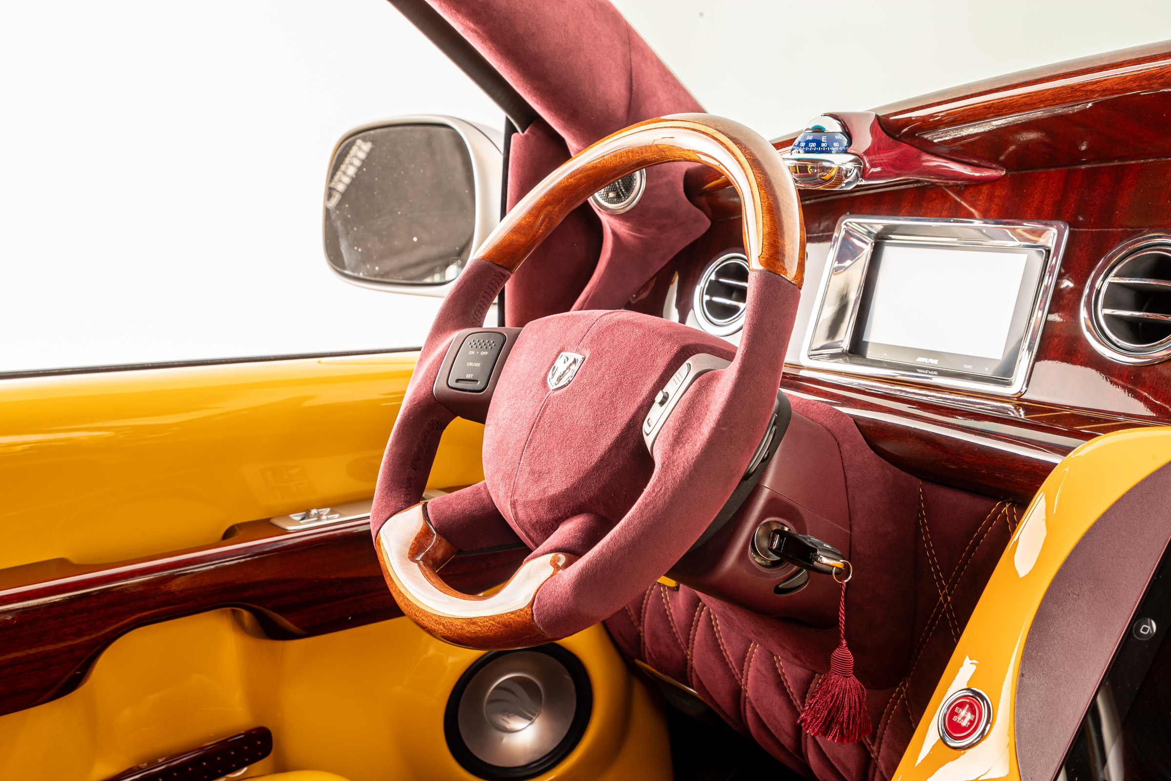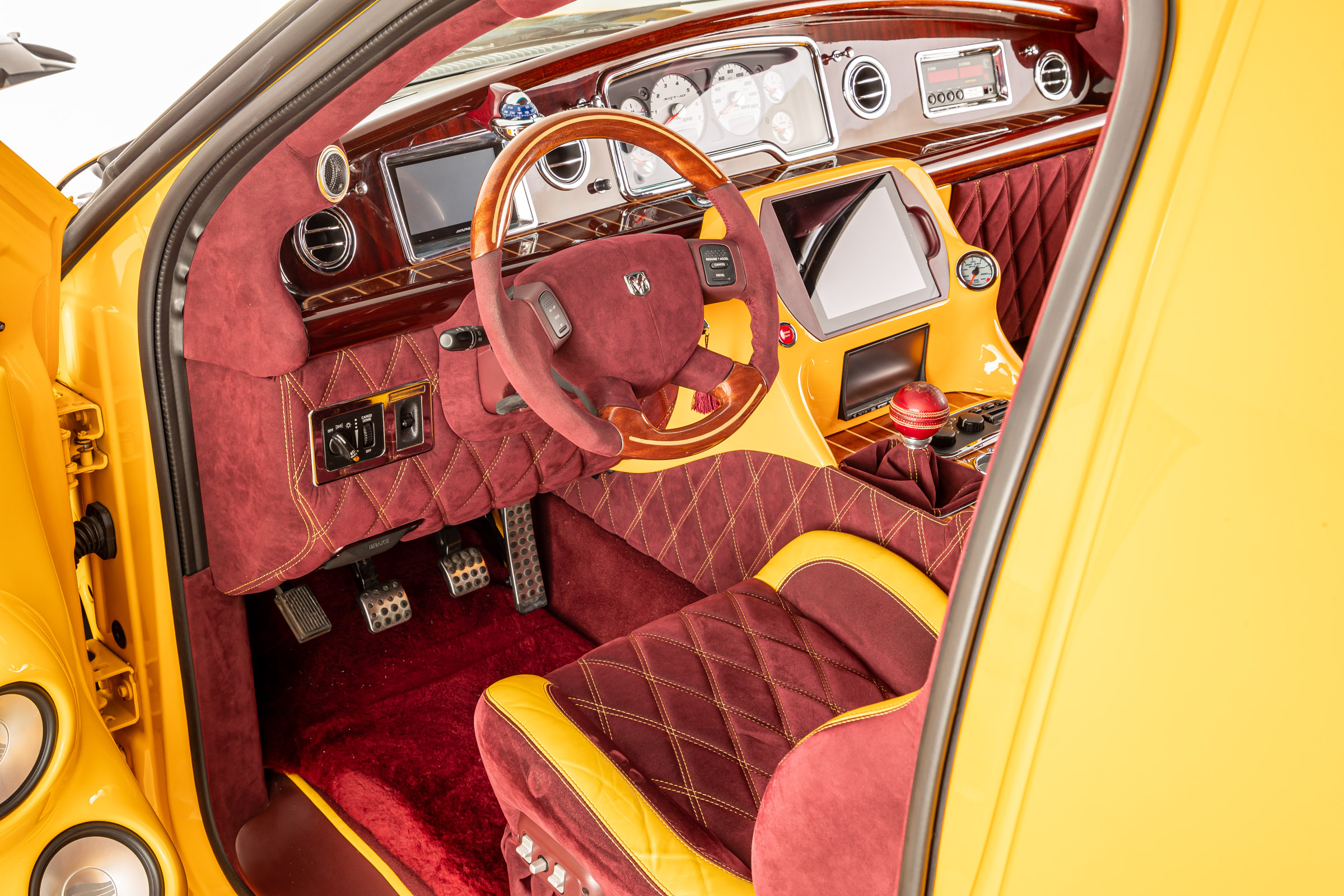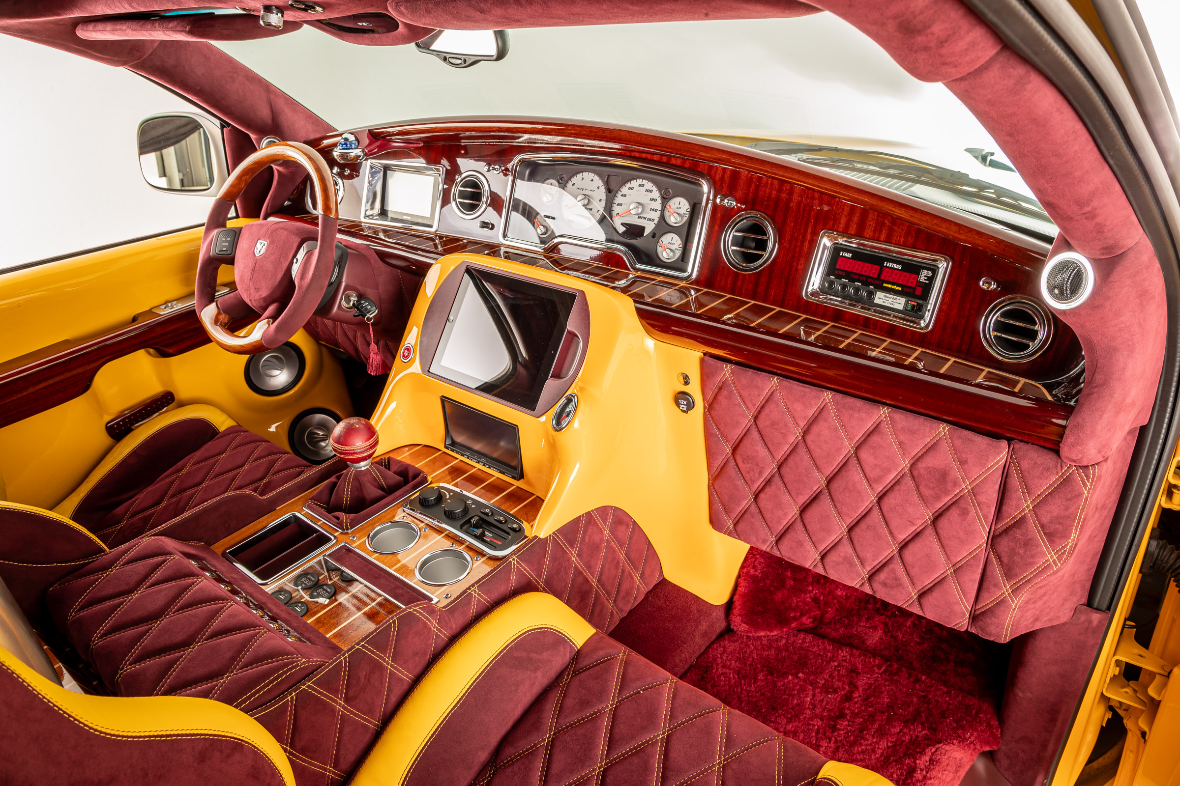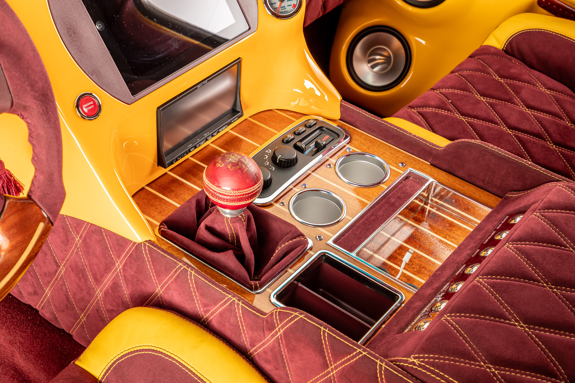 A lover of very special automobile rarities had this vehicle rebuilt regardless of cost and without compromise. Starting with an interior in the finest Alcantara, which was completely redesigned by hand in great detail. The finest fabrics and decorative stitching come together to create a work of art of craftsmanship. Rare precious woods, which were adapted to the interior by a renowned boat builder, present a look that creates an exciting contrast to the vehicle through its special use.