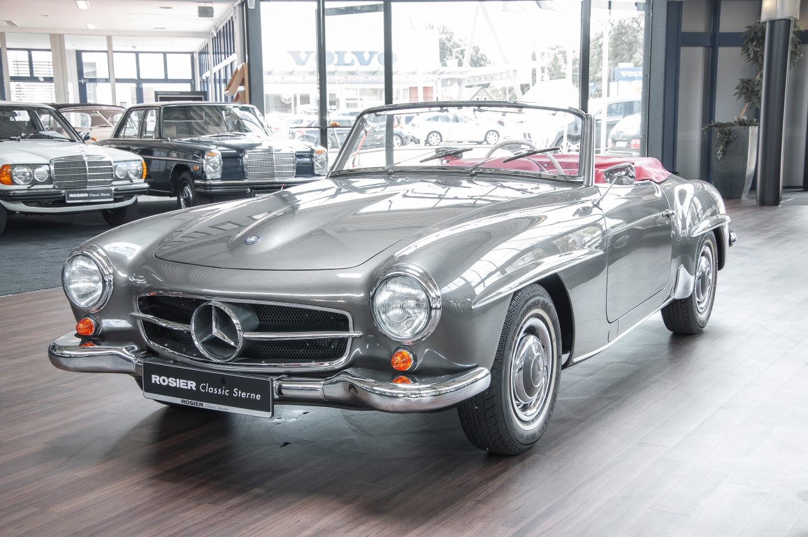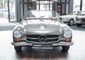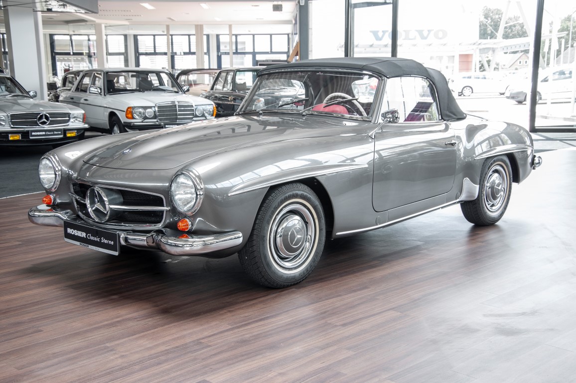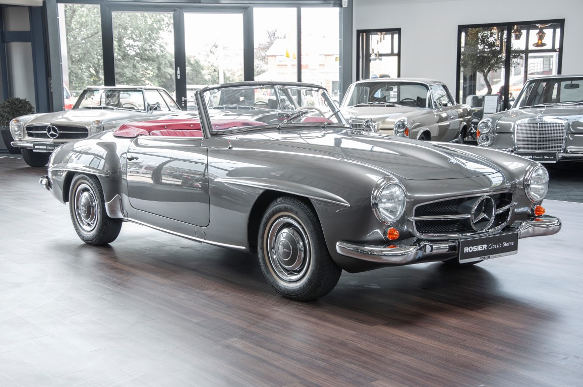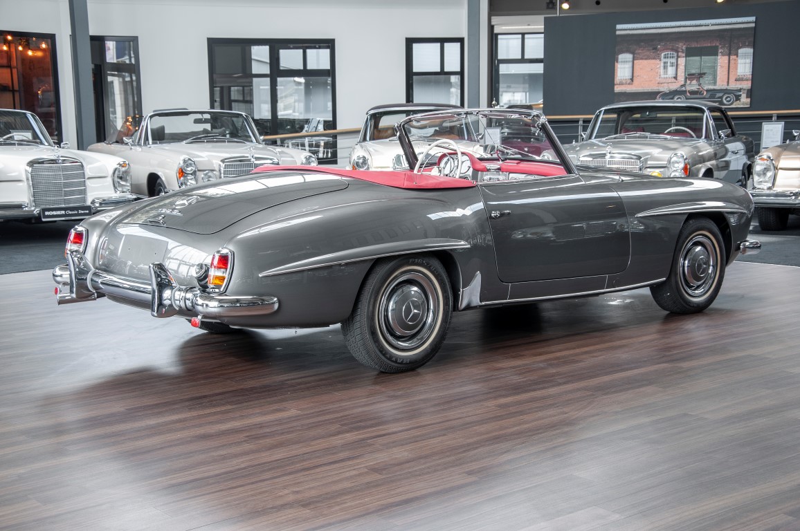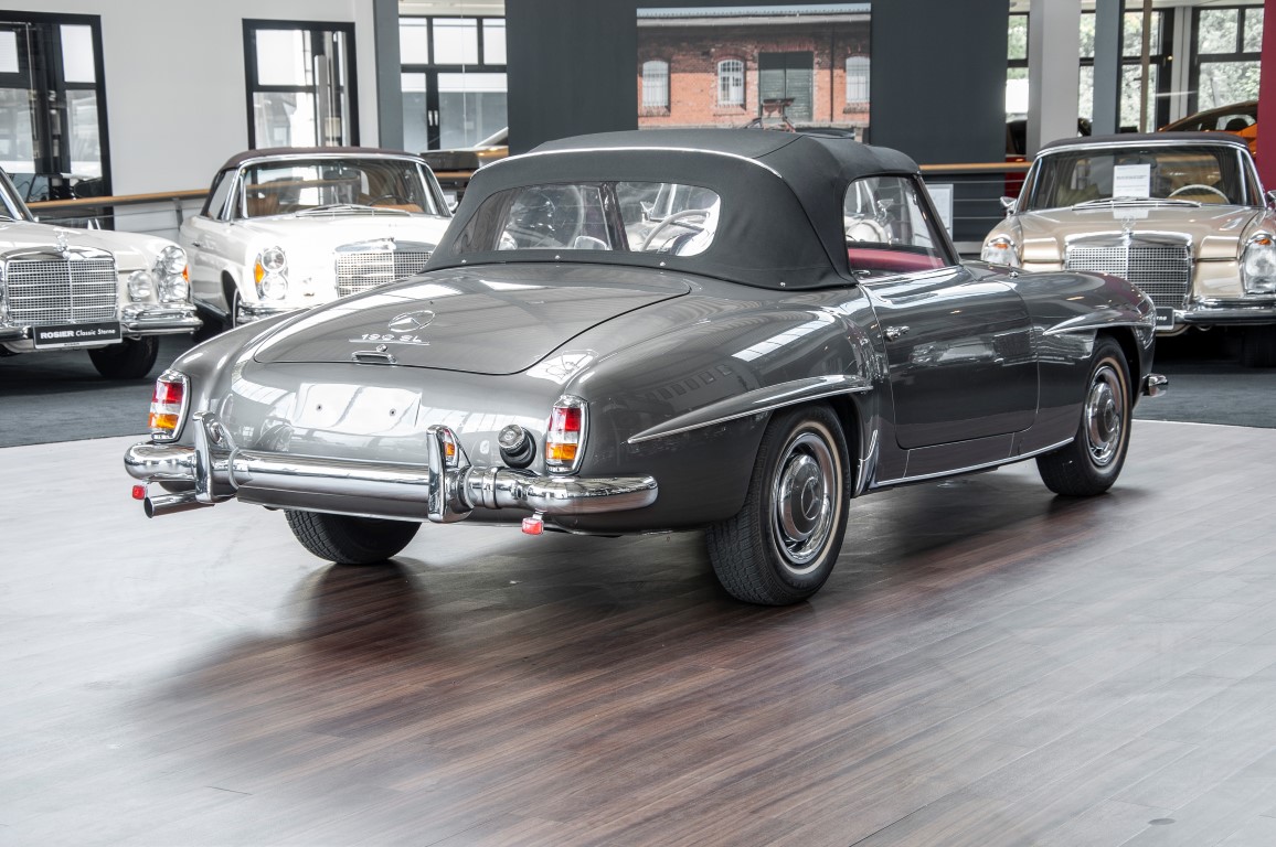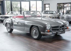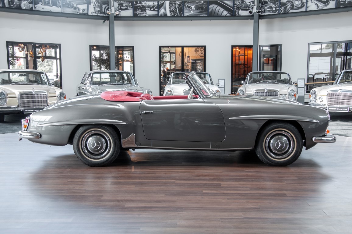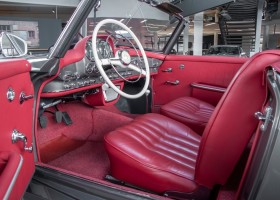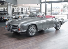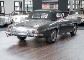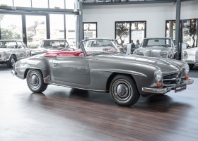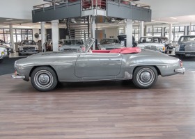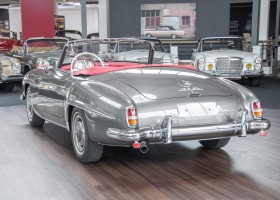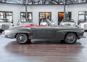 This highly elegant Mercedes-Benz 190SL Roadster was delivered in April 1959 to the general agent of Daimler-Benz, Joseph F. Weckerle, in Morocco, which had meanwhile become independent. He was a big fan of this elegant roadster series and liked to sell it to the wealthy upper class to which he maintained excellent contacts. He himself had already won the "Casablanca Grand Prix" in 1956 in a Mercedes-Benz 190SL touring sports car and had thus made a good name for himself. As a result, the roadster found its way to the USA. There it was very popular and was regarded as one of the most elegant vehicles of the 1950s and early 1960s. In 2011, the 190SL returned to its native country, Germany. A Mercedes specialist near the Swabian capital Stuttgart had acquired it. He subjected the 190SL Roadster to a detailed full restoration. The result of Swabian craftsmanship was fantastic. Everything presented itself as new. The colour scheme in the original Mercedes-Benz colour, DB 172 "anthracite grey metallic" in combination with dark red leather, made the 190SL look like its big brother the 300SL. A uniquely beautiful charisma. A prominent Swabian soon succumbed to the charm of this roadster and still owned the car today. Let yourself be captivated by the charm of this roadster, too, and soon start wonderful trips with the roof open and enjoy the friendly waving of many a participant in the traffic.
