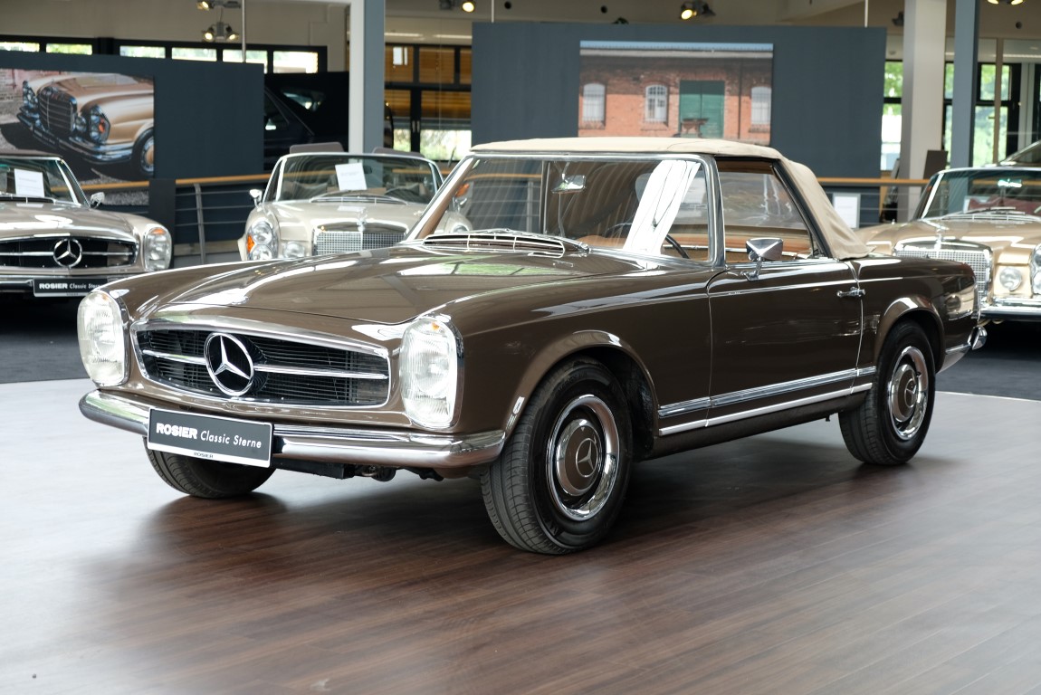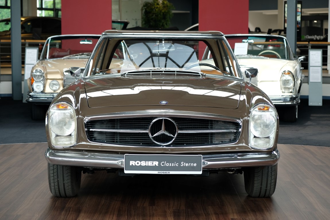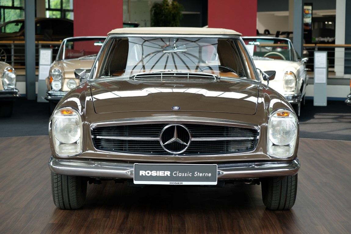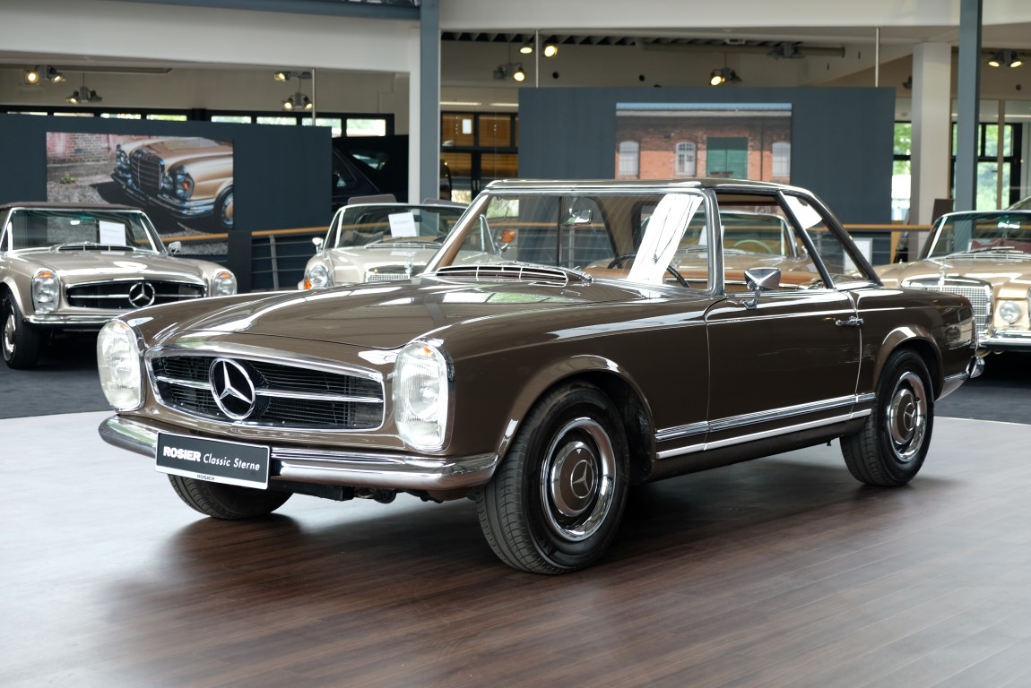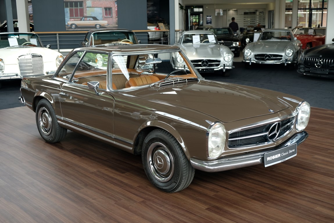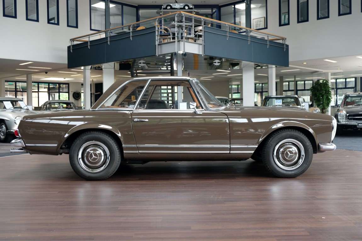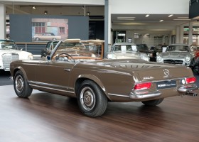 The 250 SL pagoda offered here was delivered on August 2, 1967 to a successful Dealer in Milan / Italy by the Mercedes-Benz Garage Genghini / Milano. The delivery color was Havana brown in conjunction with Havana-brown coupe roof and cognac-colored leather. Hard to beat in elegance was this color combination. The equipment included the very expensive 5-speed gearbox, which is still preserved today, as well as the original engine. The car remained for many years in sunny Italy and came in October 2013 in the possession of a doctor in Geneva / Switzerland. In 2016, the pagoda acquired a Mercedes-Benz partner from Germany and brought him back to his native country. Here he underwent the pagoda of a complex, expert restoration and put the car in its current state of . A pagoda right to drive and enjoy.