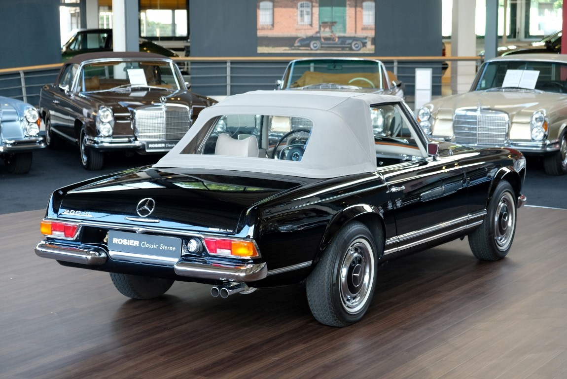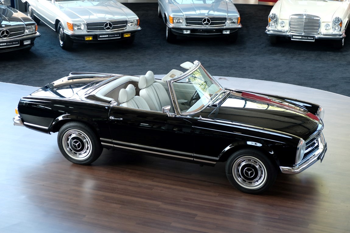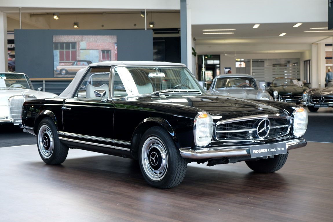 They were just around 70 years old and wanted to fulfill a long-cherished dream.They had a lot of fun at the pagoda. You kept the pagoda for about 12 years and did not give it until you decided to move to a retirement home. So the car came to Germany, to Rosier Classic sterne in Oldenburg. Here the car was subjected to extensive restoration, in the scope of which the car was completely disassembled and rebuilt. The technique has been revised and a new paint applied. When the car was completed in 2013, he found a new home in the high-quality collection of a long-standing customer of the house. Now that the collection was supplemented by another high-quality classic, had to give way to space of one of the existing vehicles. We had the choice and opted for the black 280 SL pagoda. A dream car that will surely find a new home quickly.