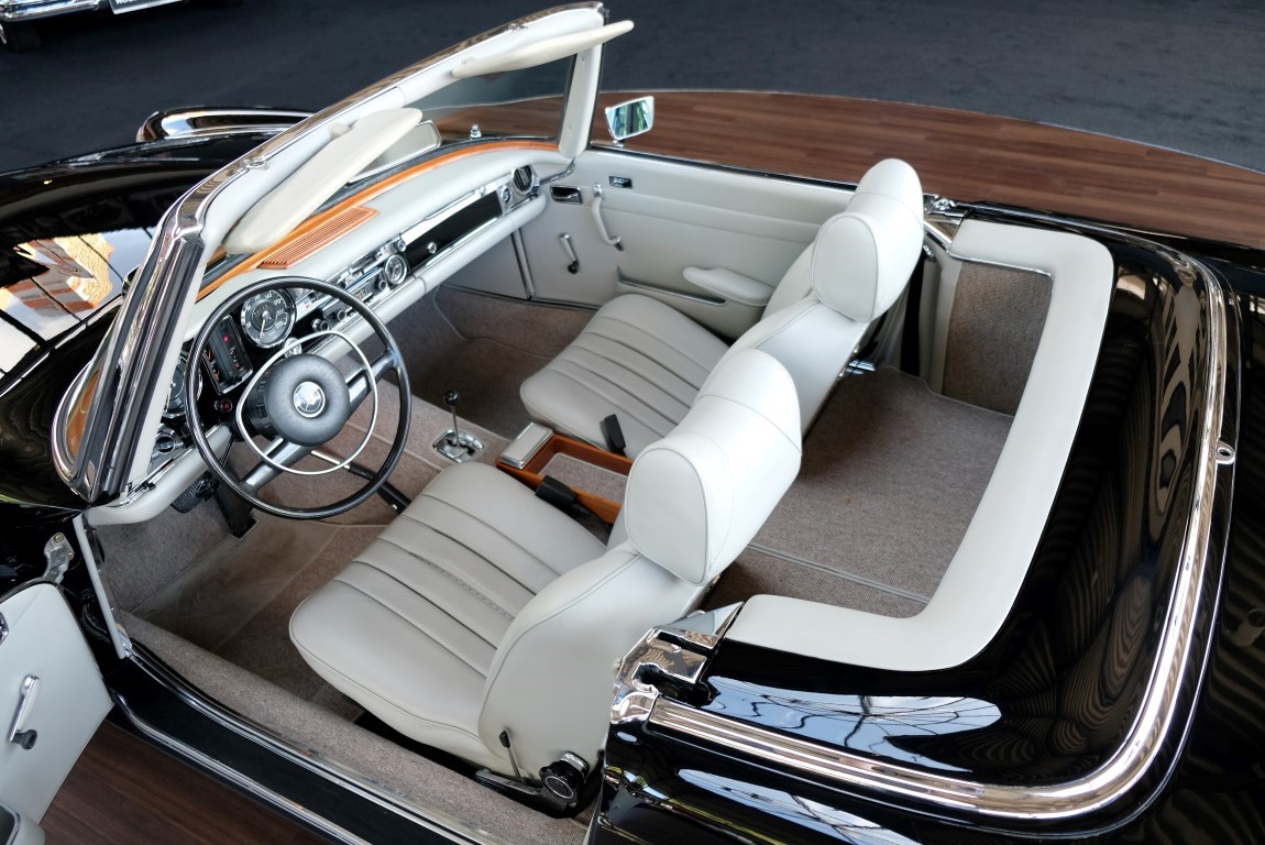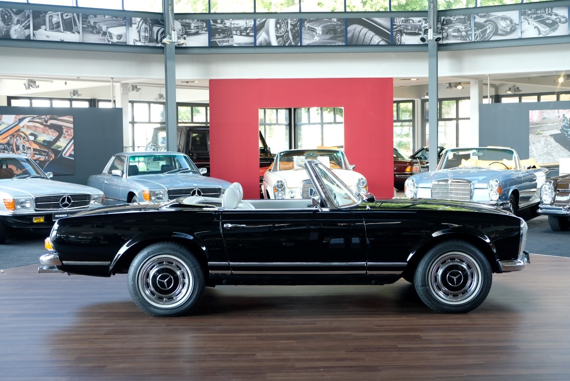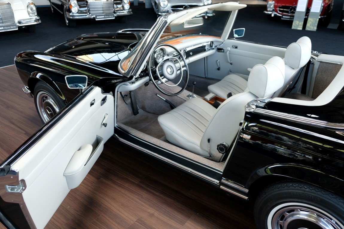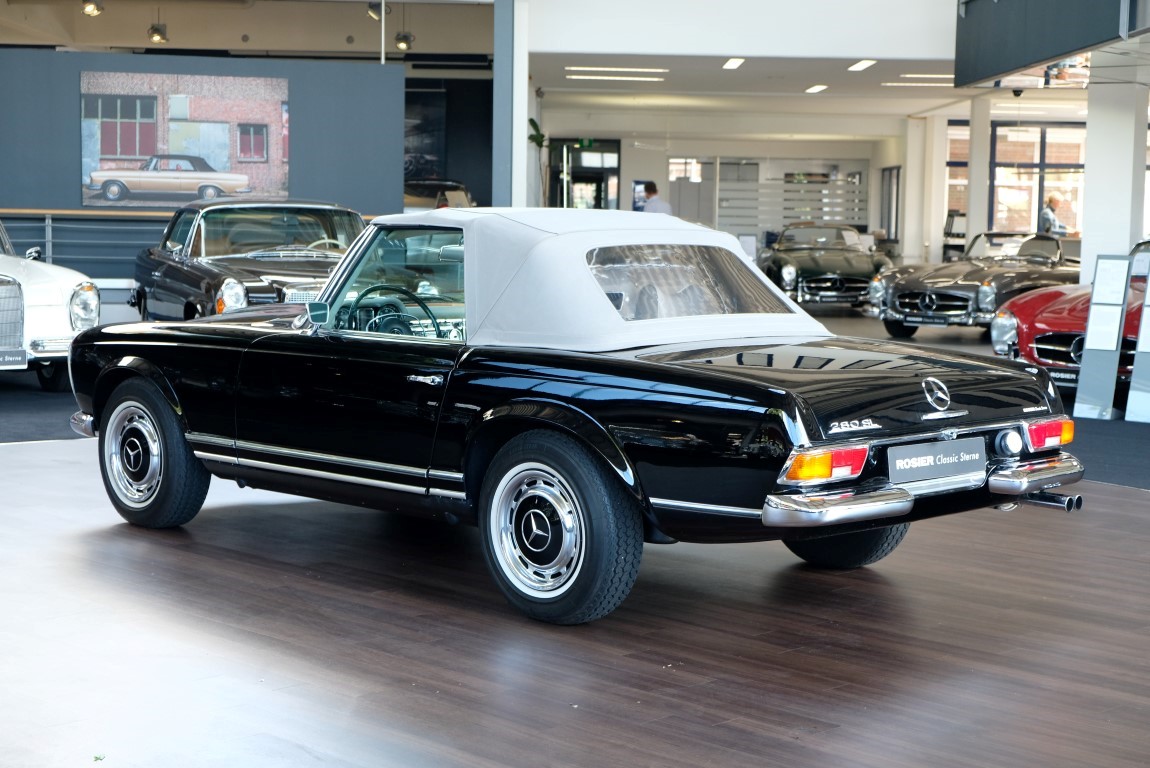 They were just around 70 years old and wanted to fulfill a long-cherished dream.They had a lot of fun at the pagoda. You kept the pagoda for about 12 years and did not give it until you decided to move to a retirement home. So the car came to Germany, to Rosier Classic sterne in Oldenburg. Here the car was subjected to extensive restoration, in the scope of which the car was completely disassembled and rebuilt. The technique has been revised and a new paint applied. When the car was completed in 2013, he found a new home in the high-quality collection of a long-standing customer of the house. Now that the collection was supplemented by another high-quality classic, had to give way to space of one of the existing vehicles. We had the choice and opted for the black 280 SL pagoda. A dream car that will surely find a new home quickly.