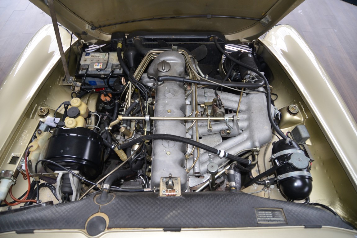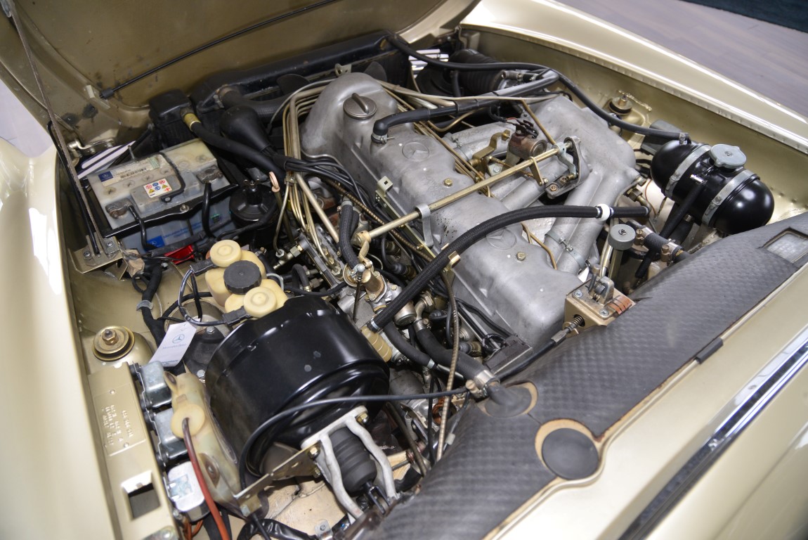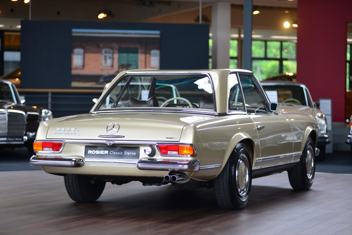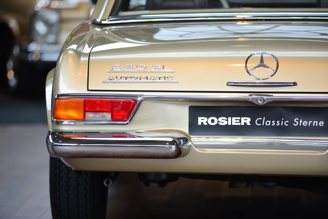 This Mercedes-Benz 280SL Roadster from the so popular series W113 was delivered on 18.04.1968 to an old-established furniture store in Hamburg. The maintenance was mostly done at Mercedes-Benz in Hamburg, as still existing copies of invoices prove. A new factory gearbox was installed in 1981, which is proven by the original Aggregate-Pass. The car remained there until it was sold to a hotelier in Belgium in 2007. The Mercedes-Benz partner in Mechelen provided all the years for the best possible maintenance and preservation of the car. The hotelier kept the roadster in his possession until 2014. In 2014 the elegant pagoda came in excellent condition to Mercedes-Benz partner Autohaus Rosier in the Ammerländer Heerstraße in Oldenburg. An extensive inspection was carried out and the car was put in top condition. The leather upholstery was faithfully renewed by the Mönnich car saddlery in Oldenburg, known for the best leather work. A lover of classic Mercedes-Benz vehicles had taken a great liking to the car and purchased it for his collection. In order to preserve the car and to avoid damage to the car, the pagoda was occasionally used for journeys only in good weather. Now that the collection is to be reduced in size, we are pleased to be able to offer you this magnificent pagoda again. Everything works, no maintenance jam, ready for use even on long distances.