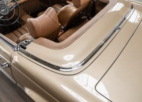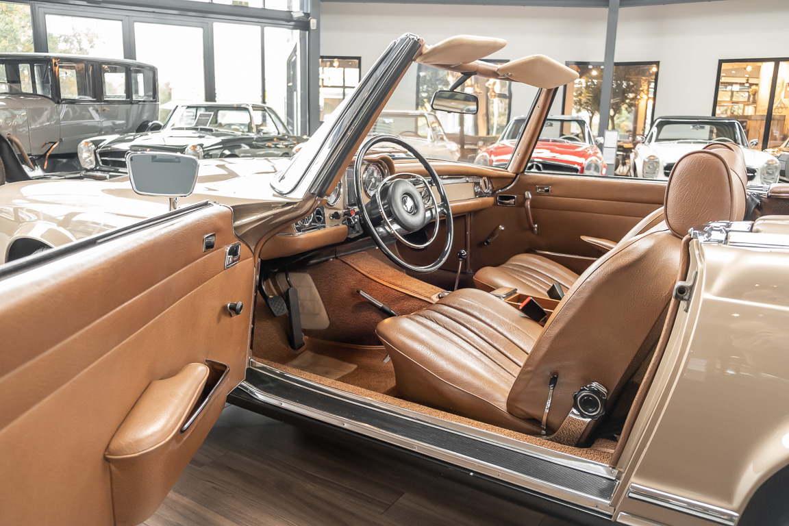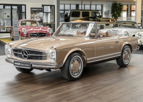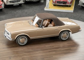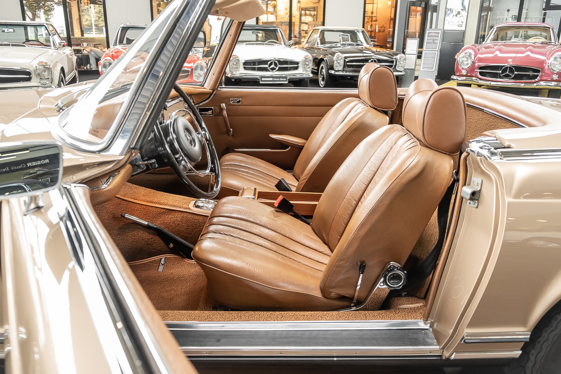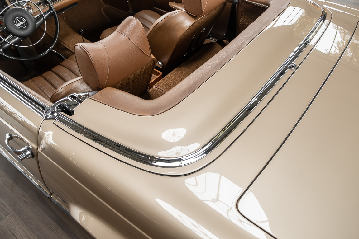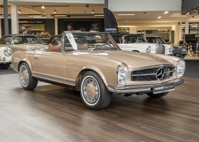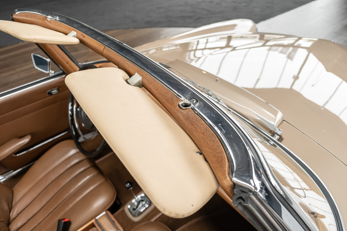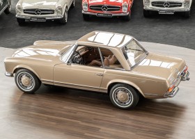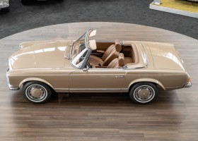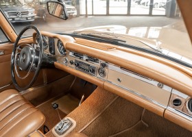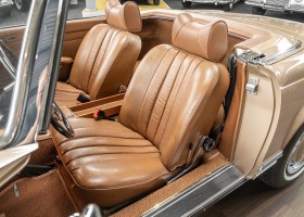 The offered Mercedes-Benz 280SL Pagoda was completed in 1969 in the Mercedes factory and delivered to the USA. The elegant color scheme in Sand Beige Metallic in combination with cognac-colored interior emphasized the elegant appearance to a very special extent even at that time. In March 1972, the car was sold by its first owner to London, Great Britain. It came into the possession of a diplomat's family who lived next to Primrose Hill not far from the wonderfully beautiful Regent's Park, in an elegant area of London. Presumably it was the lady of the house who used the car in London and in Geneva, Switzerland. After about 30 years of ownership, the family decided to sell the Pagoda. So in February 2001, a Swiss restaurateur from picturesque Fribourg in western Switzerland took over the Pagoda. During his ownership, a factory exchange engine was installed at an authorized Mercedes-Benz partner in July 2001. The original invoice for just under CHF 30,000 is available. In 2003 the car was acquired by a German manufacturer for his collection. He had the Pagoda professionally overhauled where necessary and restored it to its current dream condition. After almost 20 years in collector's possession and care, the chic roadster is to get a new home. Take your chance on a solid vehicle, with a great traceable history. We are happy to advise you.