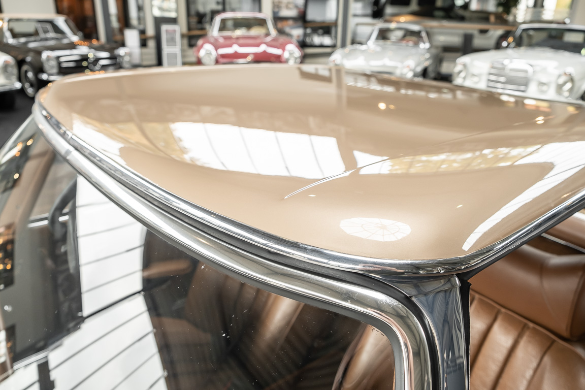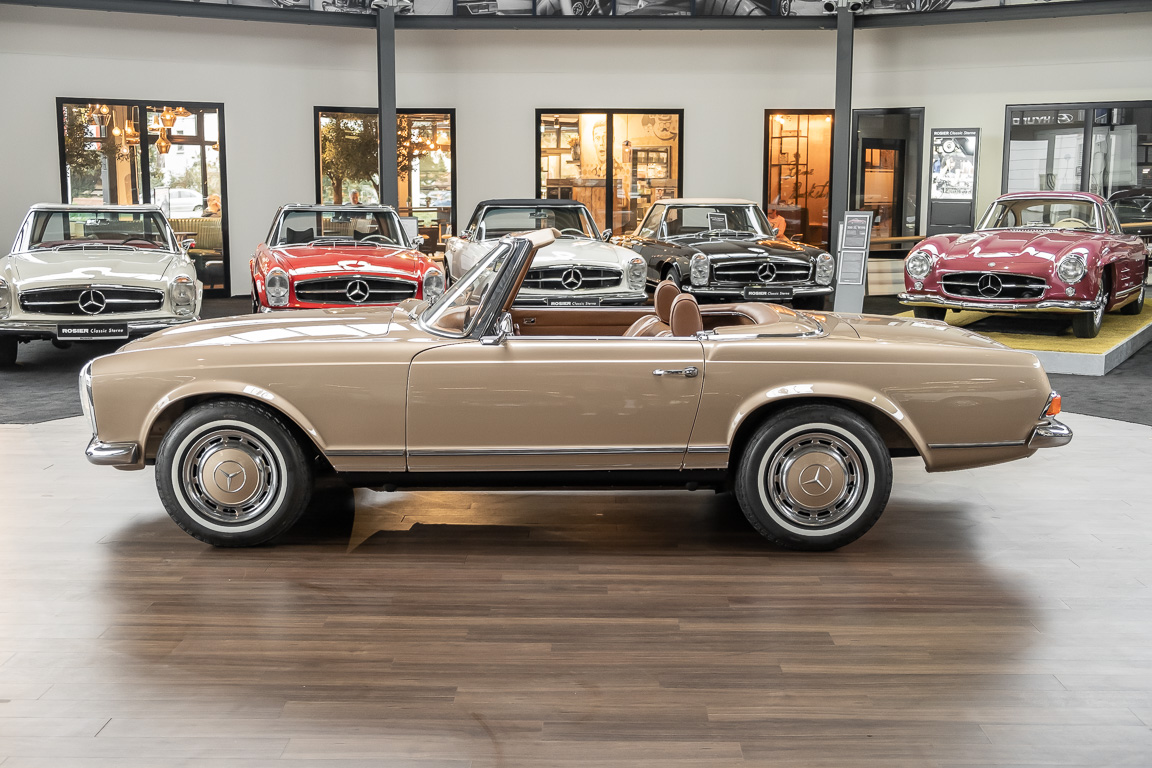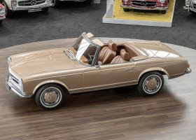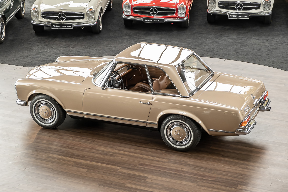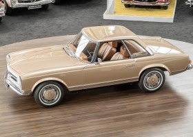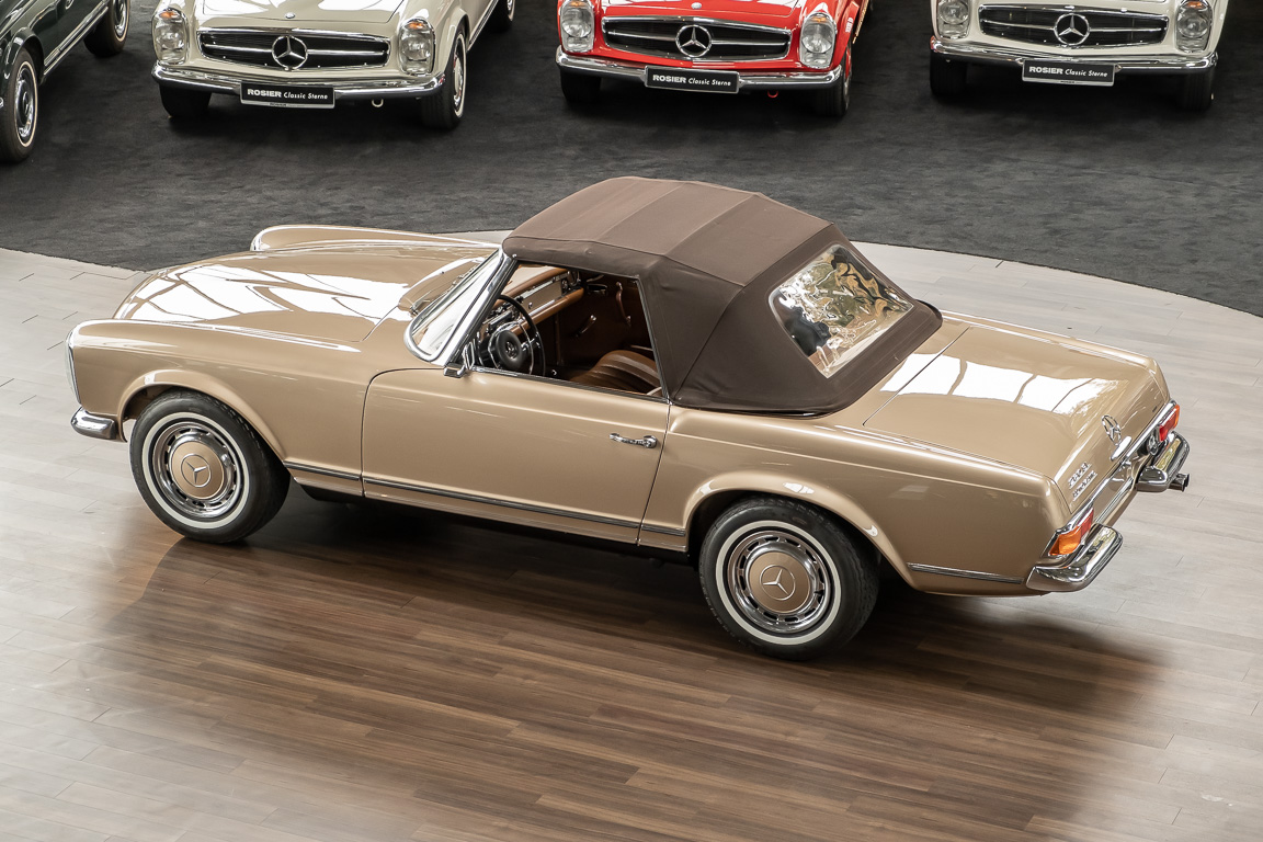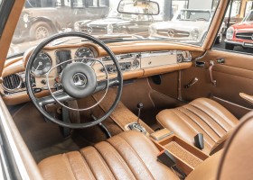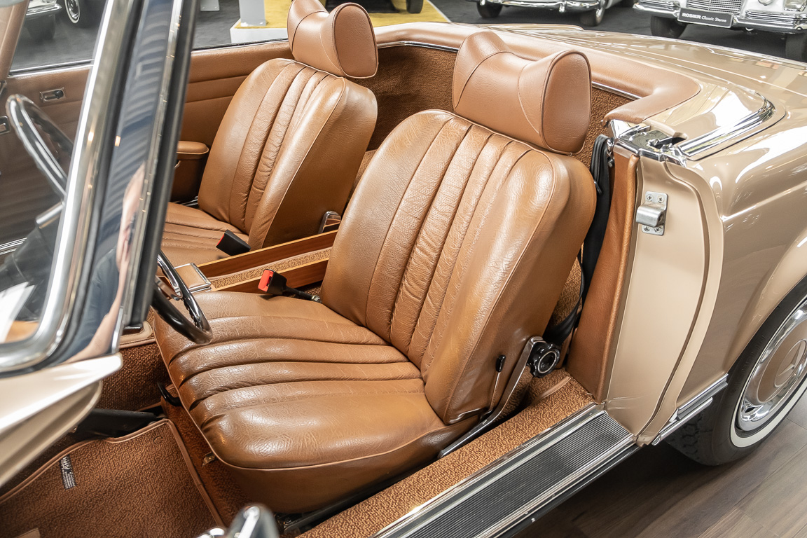 The offered Mercedes-Benz 280SL Pagoda was completed in 1969 in the Mercedes factory and delivered to the USA. The elegant color scheme in Sand Beige Metallic in combination with cognac-colored interior emphasized the elegant appearance to a very special extent even at that time. In March 1972, the car was sold by its first owner to London, Great Britain. It came into the possession of a diplomat's family who lived next to Primrose Hill not far from the wonderfully beautiful Regent's Park, in an elegant area of London. Presumably it was the lady of the house who used the car in London and in Geneva, Switzerland. After about 30 years of ownership, the family decided to sell the Pagoda. So in February 2001, a Swiss restaurateur from picturesque Fribourg in western Switzerland took over the Pagoda. During his ownership, a factory exchange engine was installed at an authorized Mercedes-Benz partner in July 2001. The original invoice for just under CHF 30,000 is available. In 2003 the car was acquired by a German manufacturer for his collection. He had the Pagoda professionally overhauled where necessary and restored it to its current dream condition. After almost 20 years in collector's possession and care, the chic roadster is to get a new home. Take your chance on a solid vehicle, with a great traceable history. We are happy to advise you.