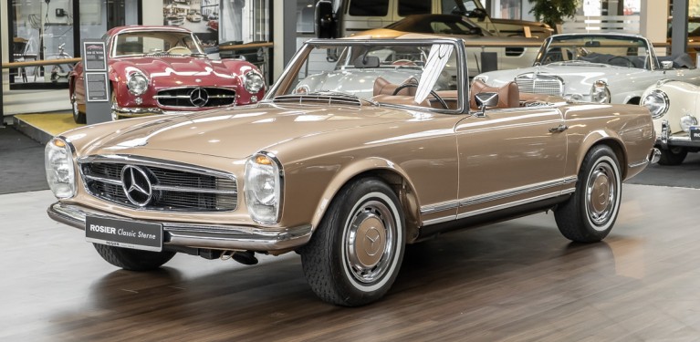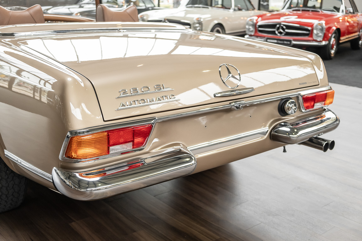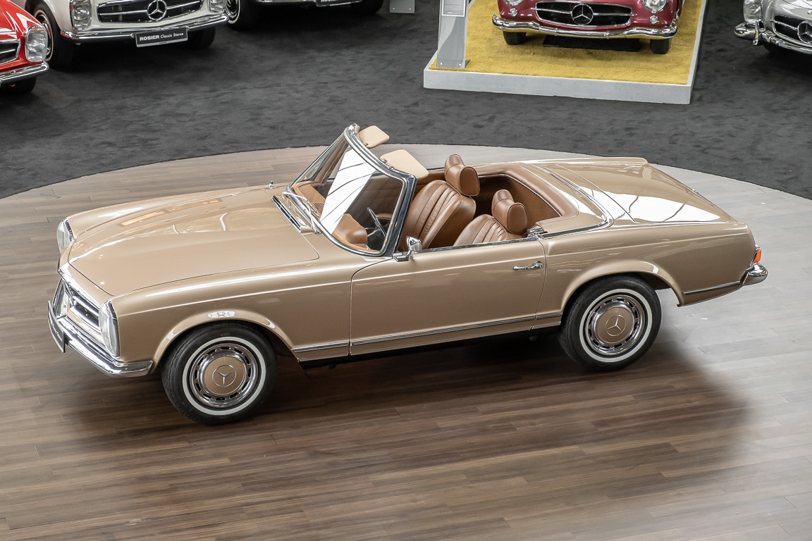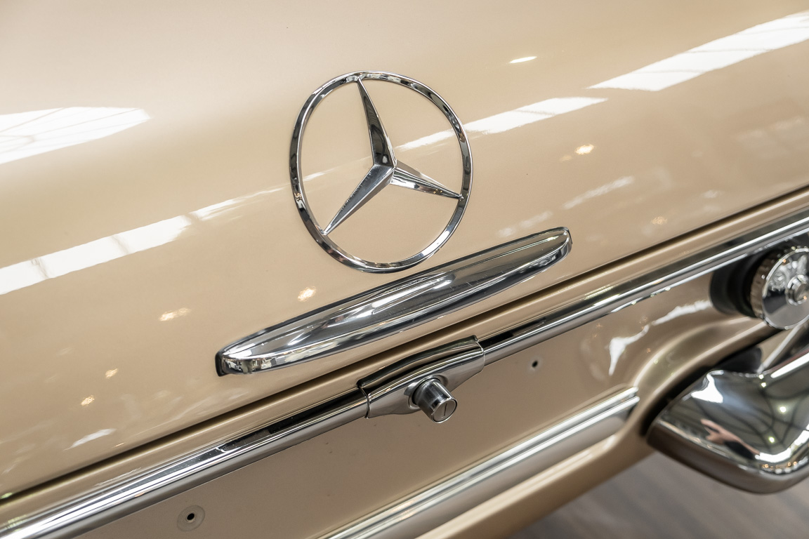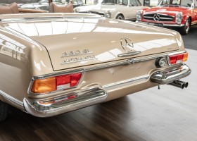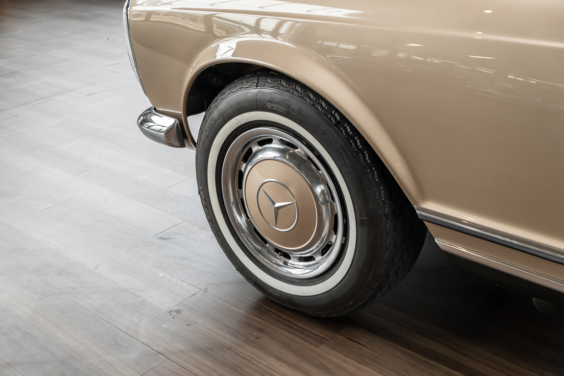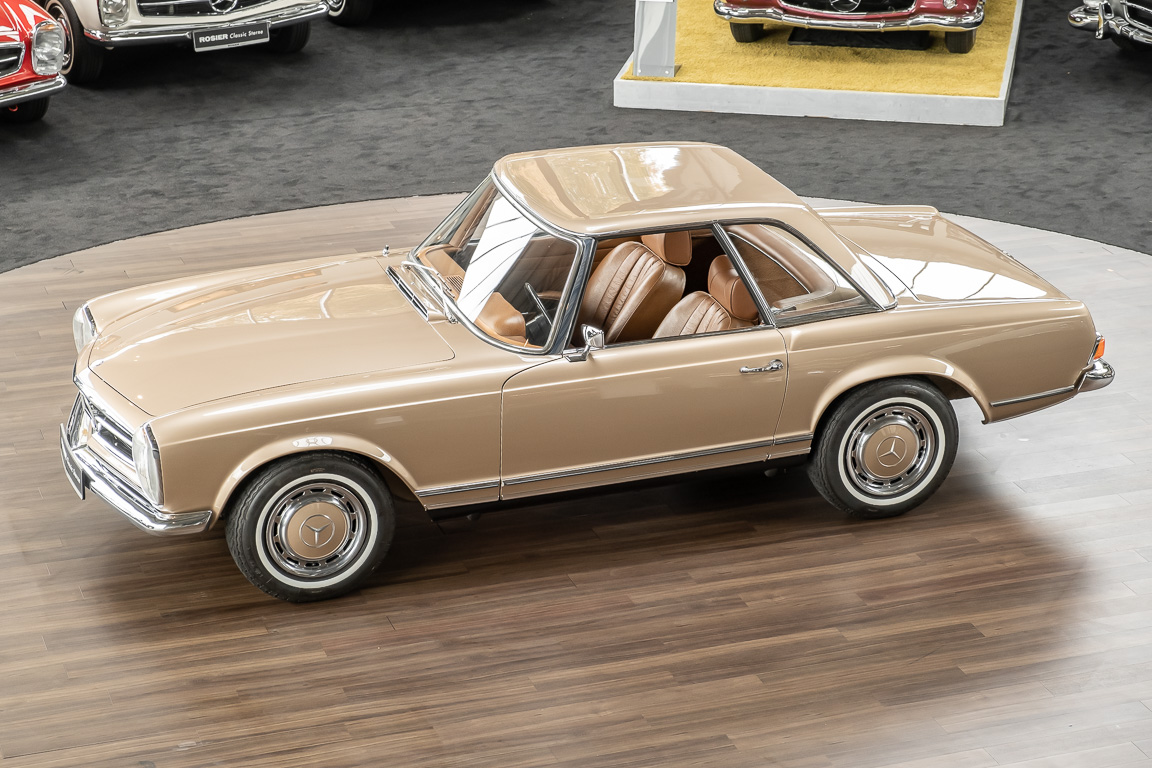 The offered Mercedes-Benz 280SL Pagoda was completed in 1969 in the Mercedes factory and delivered to the USA. The elegant color scheme in Sand Beige Metallic in combination with cognac-colored interior emphasized the elegant appearance to a very special extent even at that time. In March 1972, the car was sold by its first owner to London, Great Britain. It came into the possession of a diplomat's family who lived next to Primrose Hill not far from the wonderfully beautiful Regent's Park, in an elegant area of London. Presumably it was the lady of the house who used the car in London and in Geneva, Switzerland. After about 30 years of ownership, the family decided to sell the Pagoda. So in February 2001, a Swiss restaurateur from picturesque Fribourg in western Switzerland took over the Pagoda. During his ownership, a factory exchange engine was installed at an authorized Mercedes-Benz partner in July 2001. The original invoice for just under CHF 30,000 is available. In 2003 the car was acquired by a German manufacturer for his collection. He had the Pagoda professionally overhauled where necessary and restored it to its current dream condition. After almost 20 years in collector's possession and care, the chic roadster is to get a new home. Take your chance on a solid vehicle, with a great traceable history. We are happy to advise you.