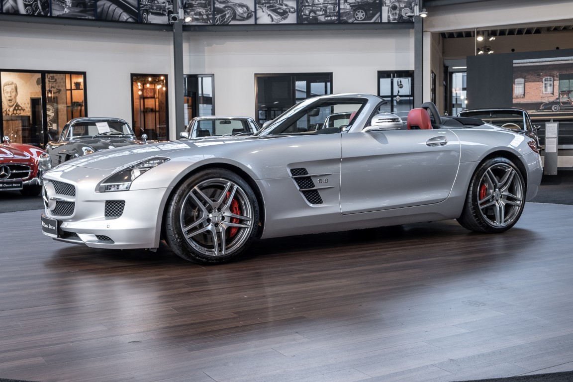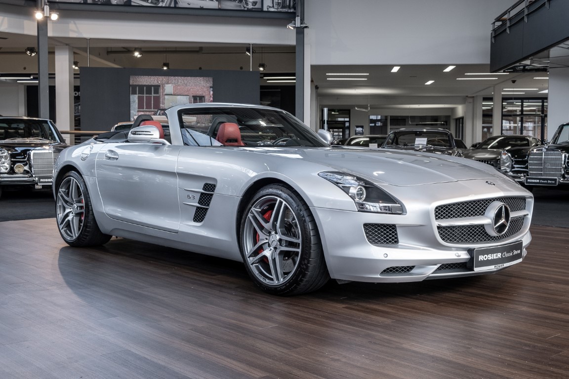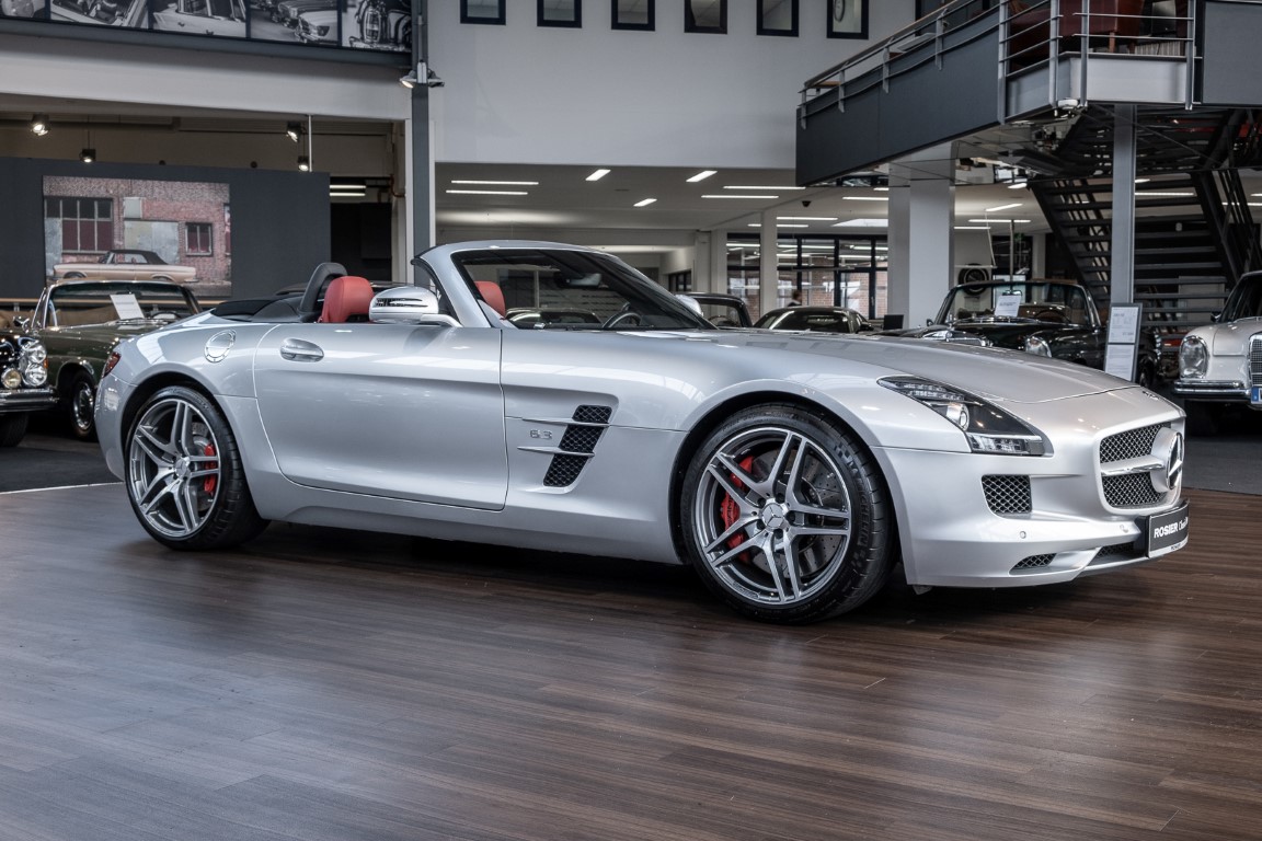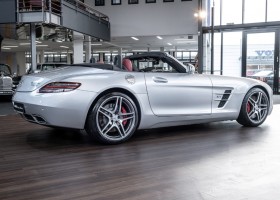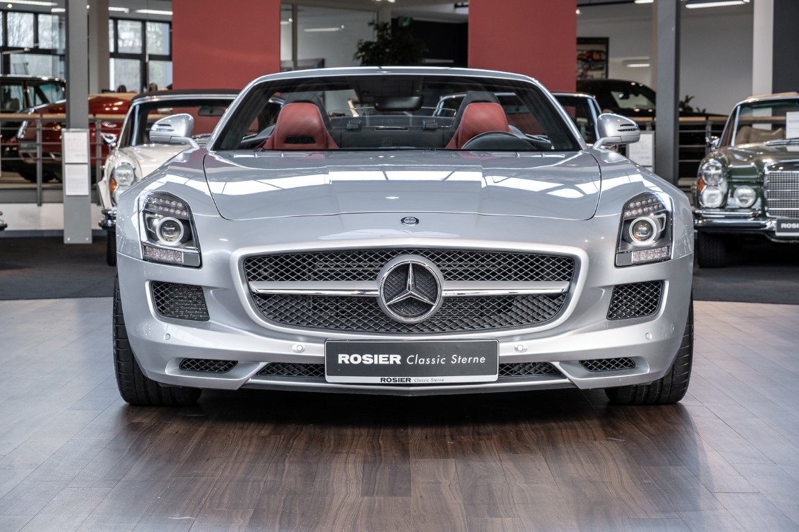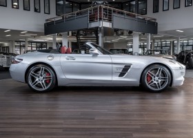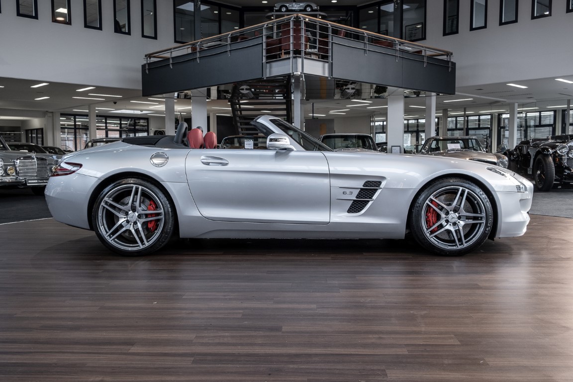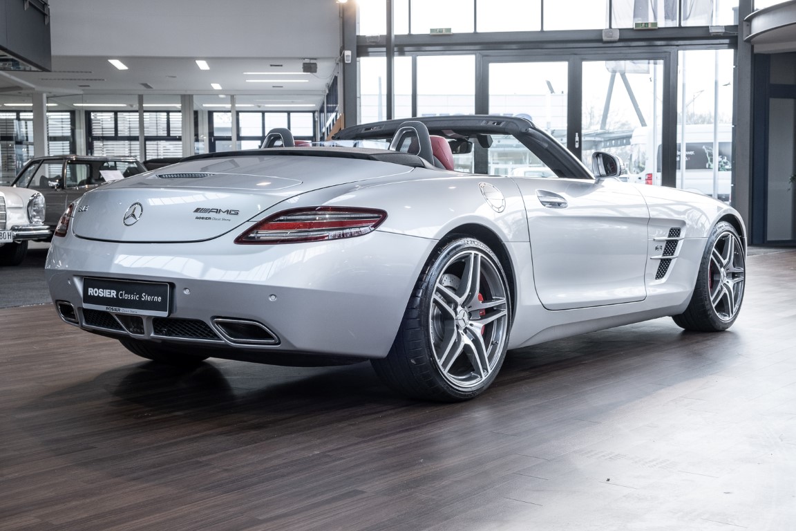 This wonderful SLS AMG Roadster in the classic-sporty combination "Iridium Silver Metallic" with red AMG Exclusive Leather is literally a Silver Arrow.