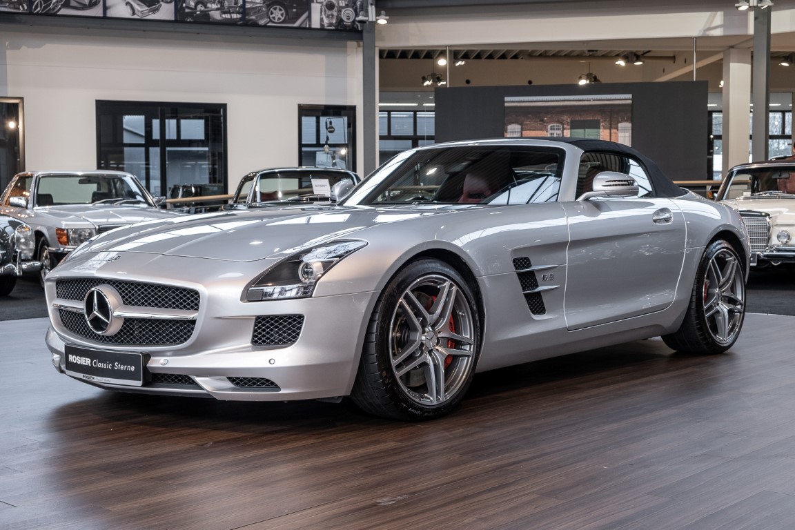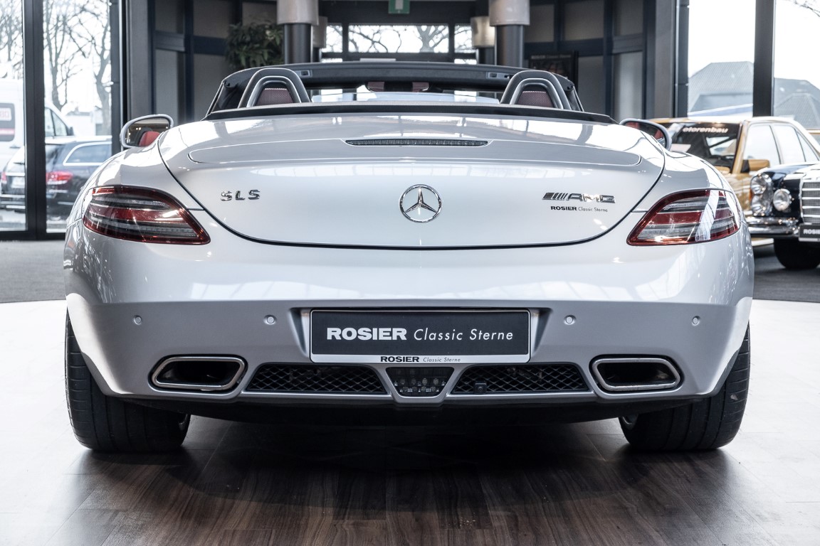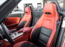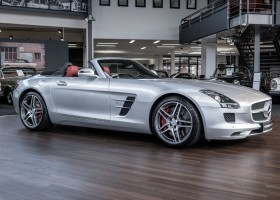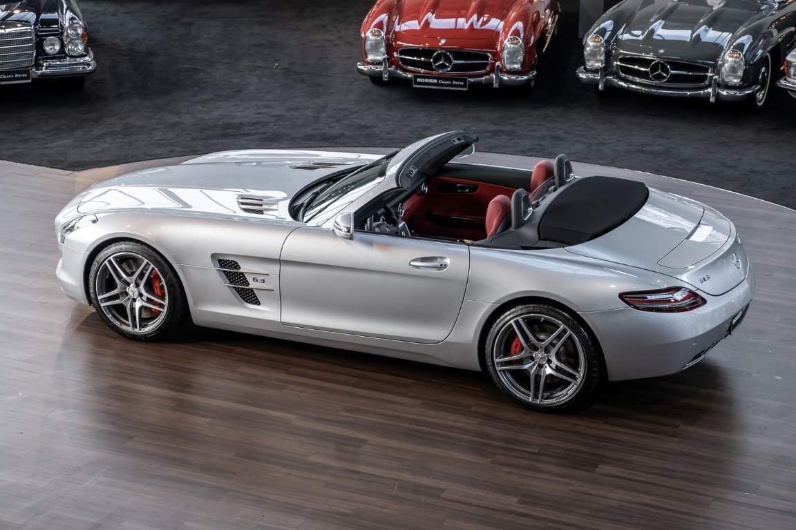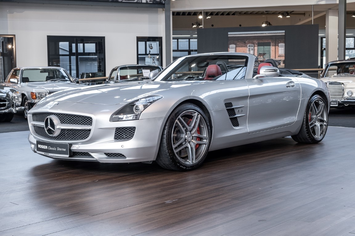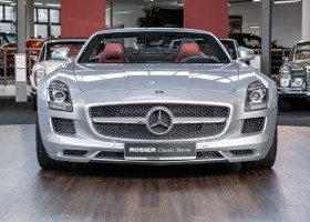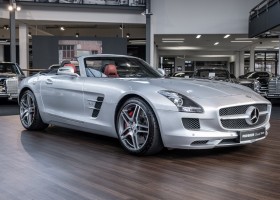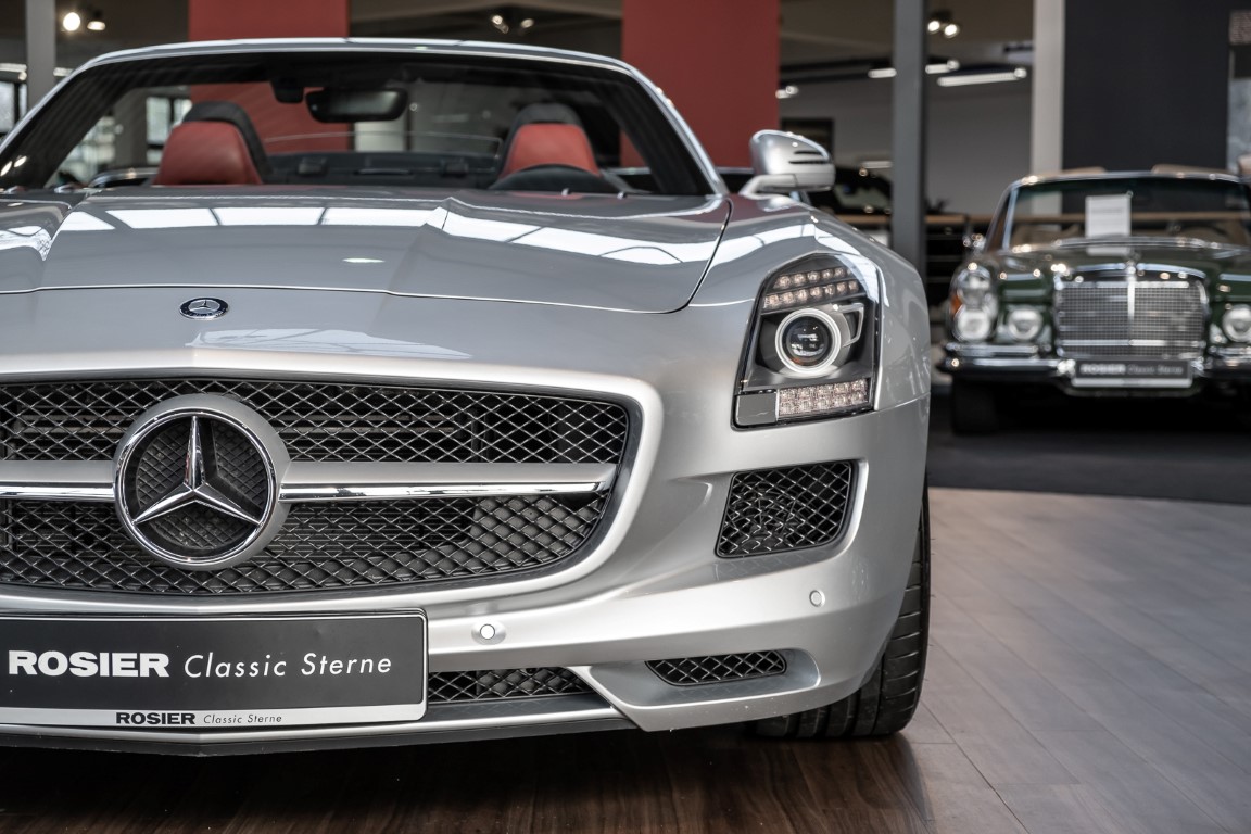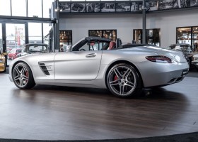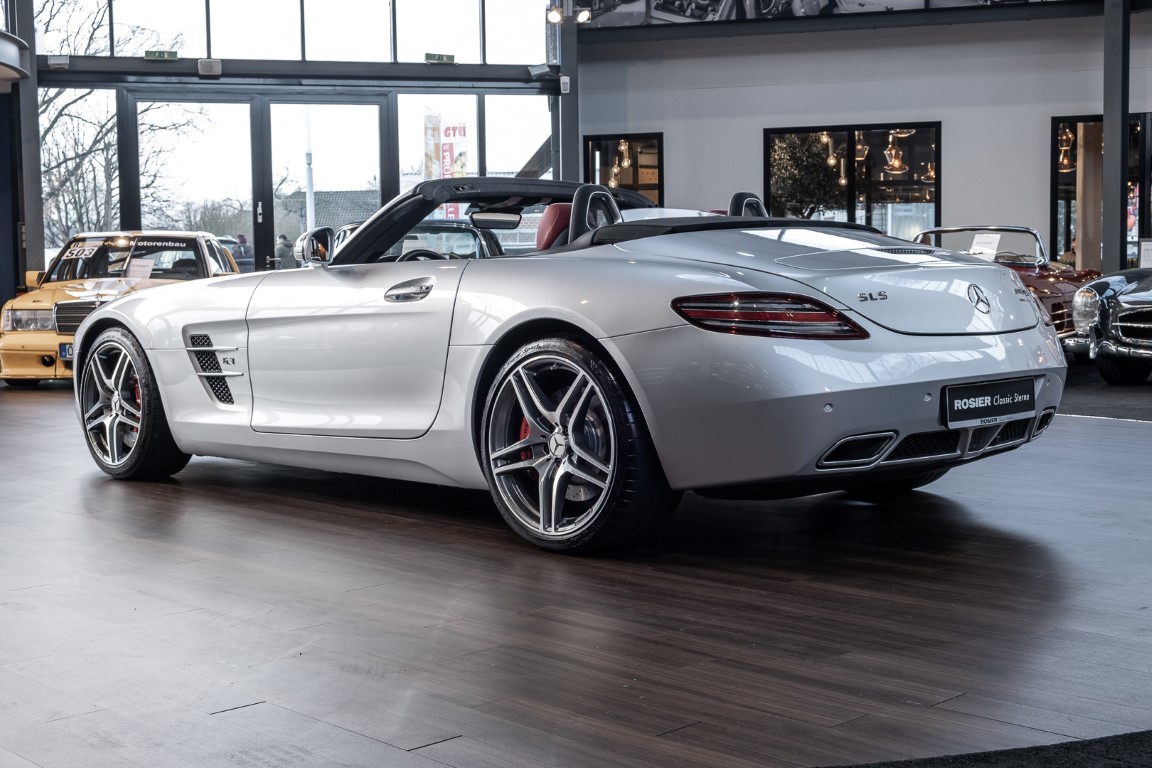 This wonderful SLS AMG Roadster in the classic-sporty combination "Iridium Silver Metallic" with red AMG Exclusive Leather is literally a Silver Arrow.