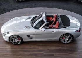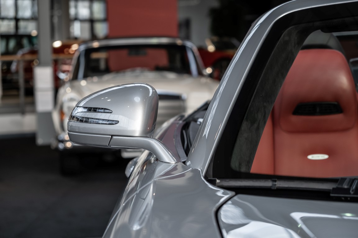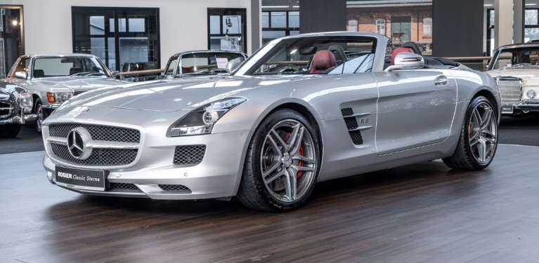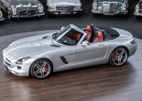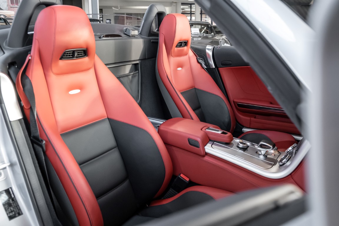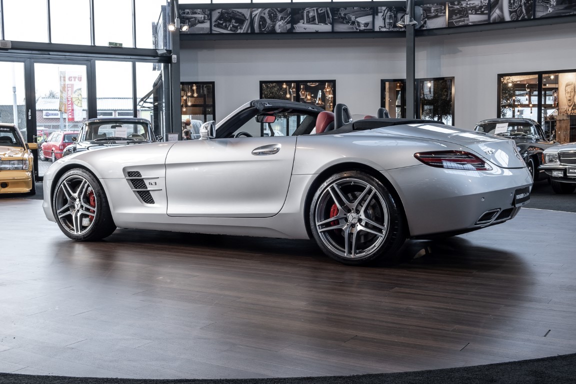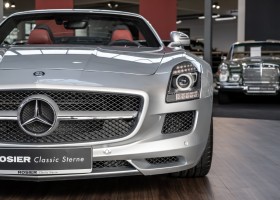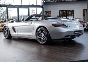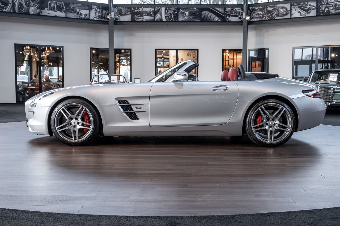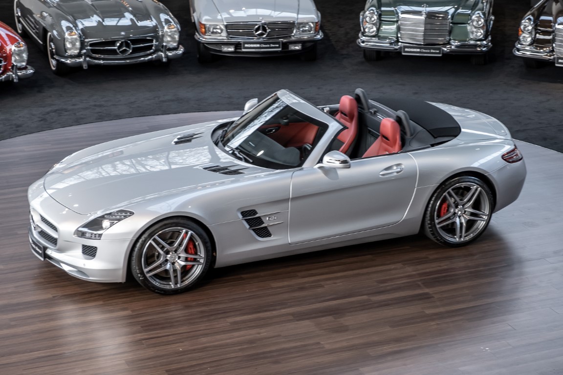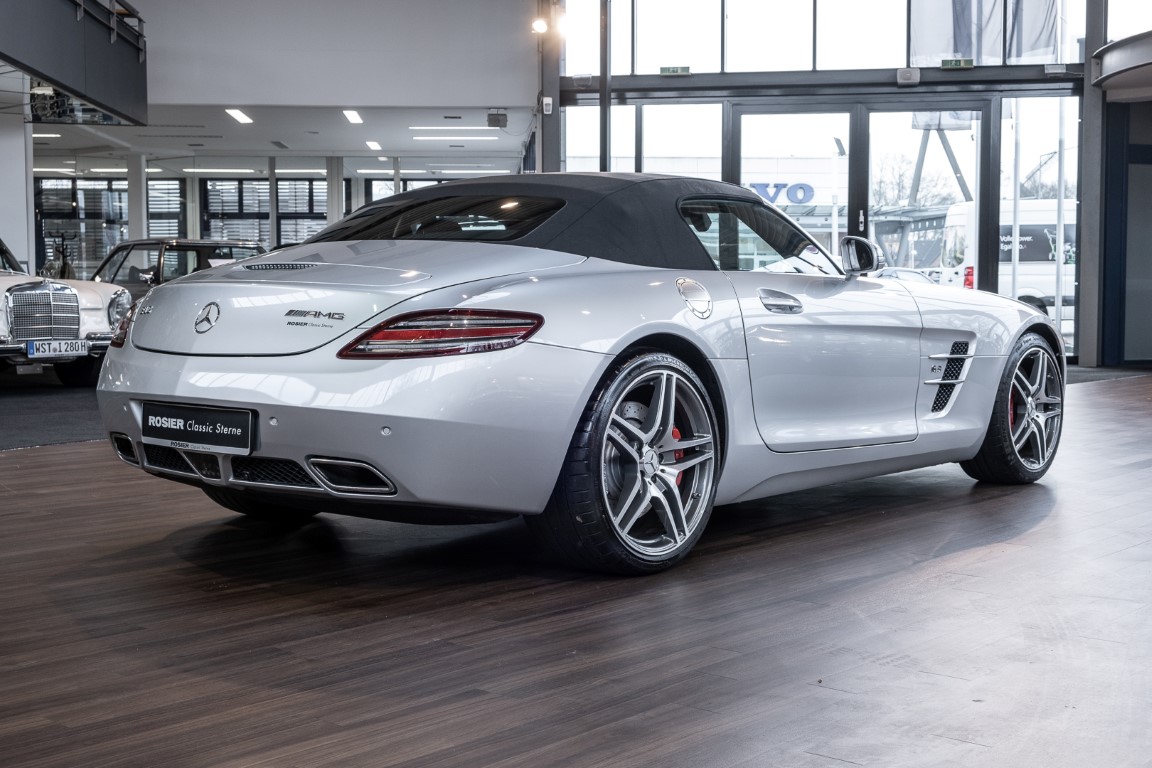 This wonderful SLS AMG Roadster in the classic-sporty combination "Iridium Silver Metallic" with red AMG Exclusive Leather is literally a Silver Arrow.